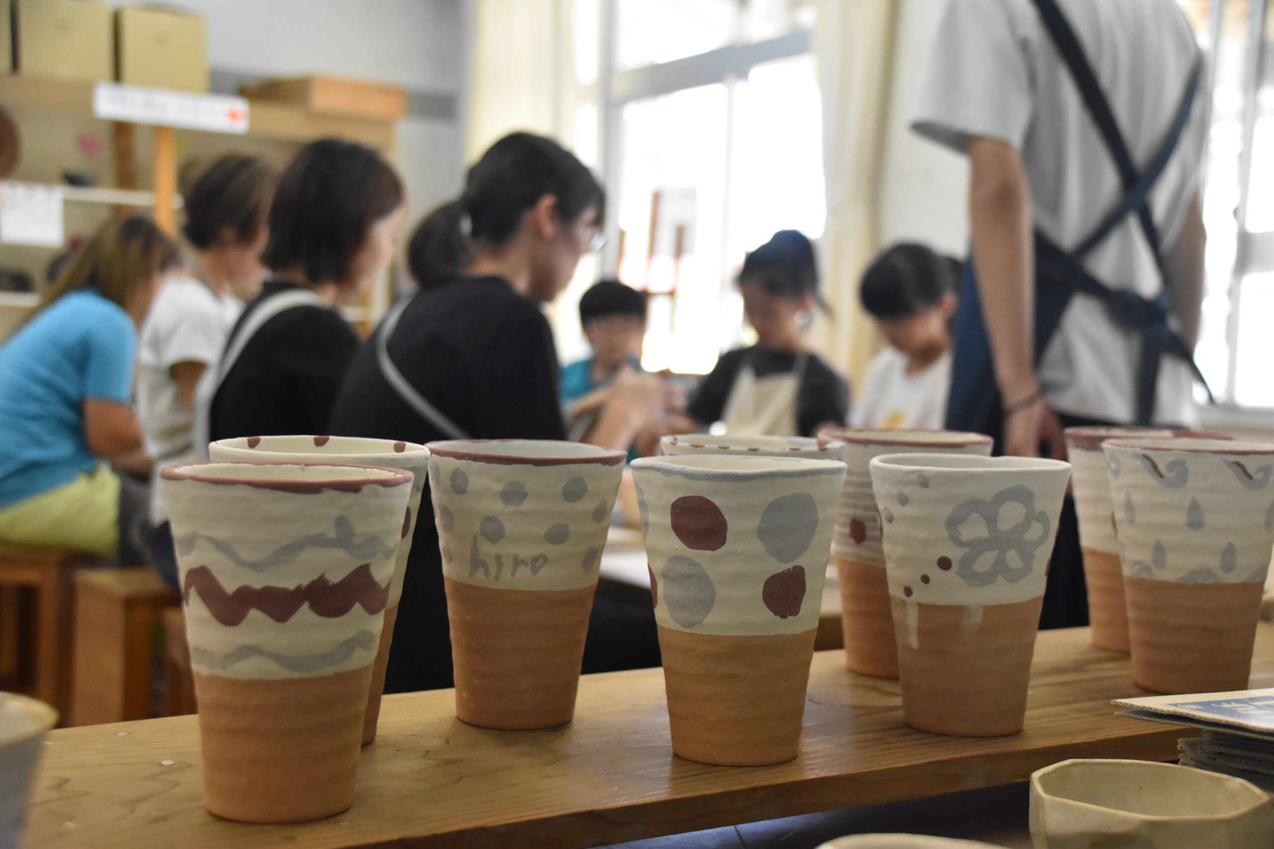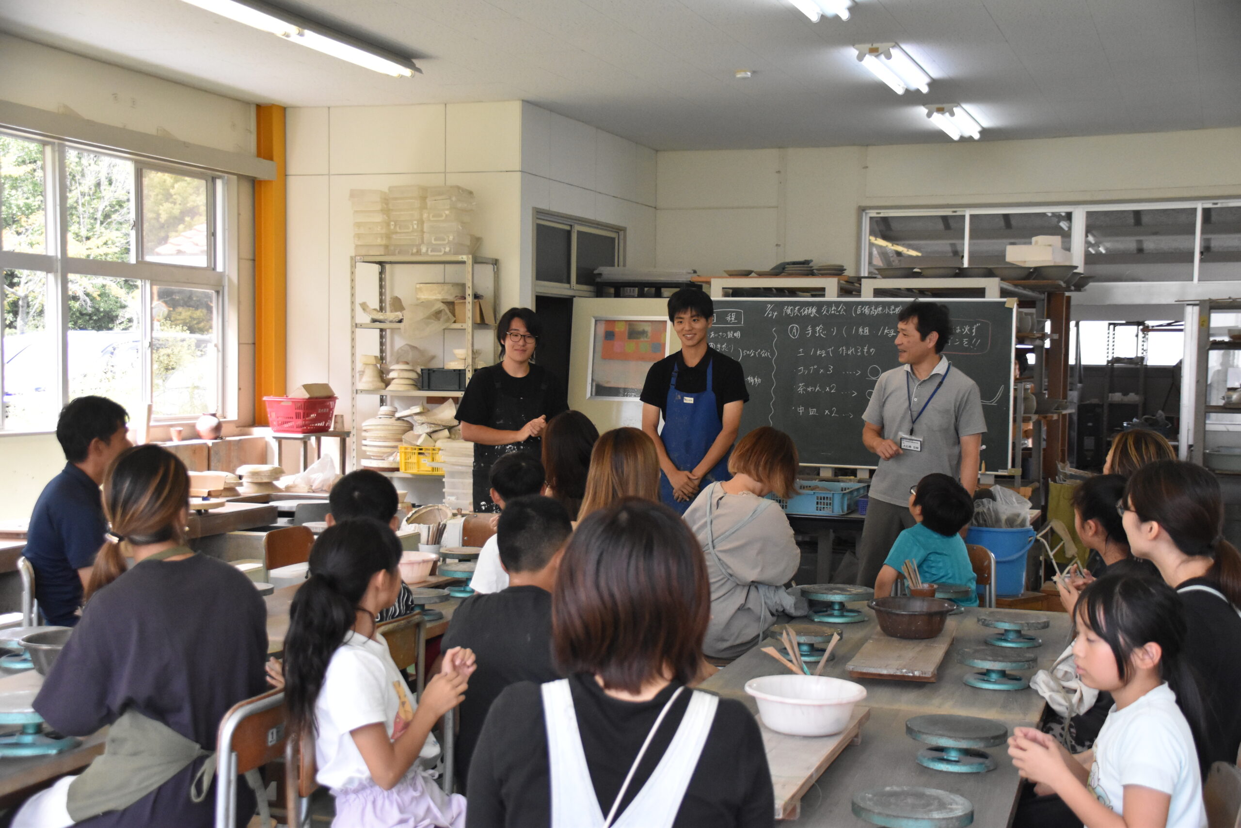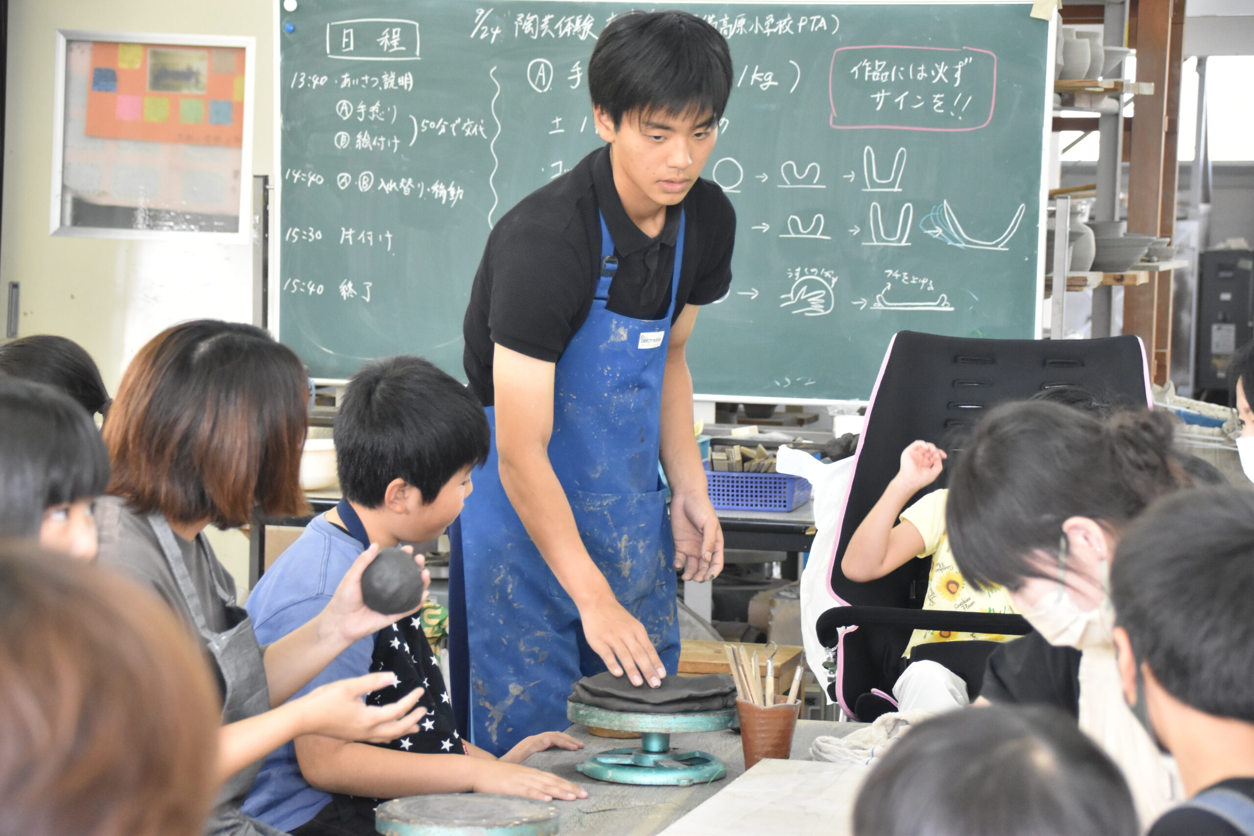 9月24日(火)吉備高原小学校PTA活動「親子陶芸教室」が本校の陶芸教室で行われました。訪れたのは、学校からすぐ近くにある吉備高原小学校の4年生20人とその保護者20人の合計40人。一度に40人受け入れることは珍しく、陶芸教室が満員でした。そこで2グループに分かれてもらい、1つは本校オリジナルブランド「のばら」のカップに絵をつけてもらう”絵付け作業”、そしてもう1つは、”手回しろくろでの制作作業”、約1時間交代で2つの行程を体験をしていただきました。写真では伝えきれなくて残念ですが、子どもたちとお母さん方が本当に楽しそうに過ごしておられました。陶芸コースの生徒達は陶芸をとおして、親子の橋渡しをするとともに、制作の魅力を伝えました。人の役に立っていることを実感し、生徒たちも心豊かに成長していると思います。