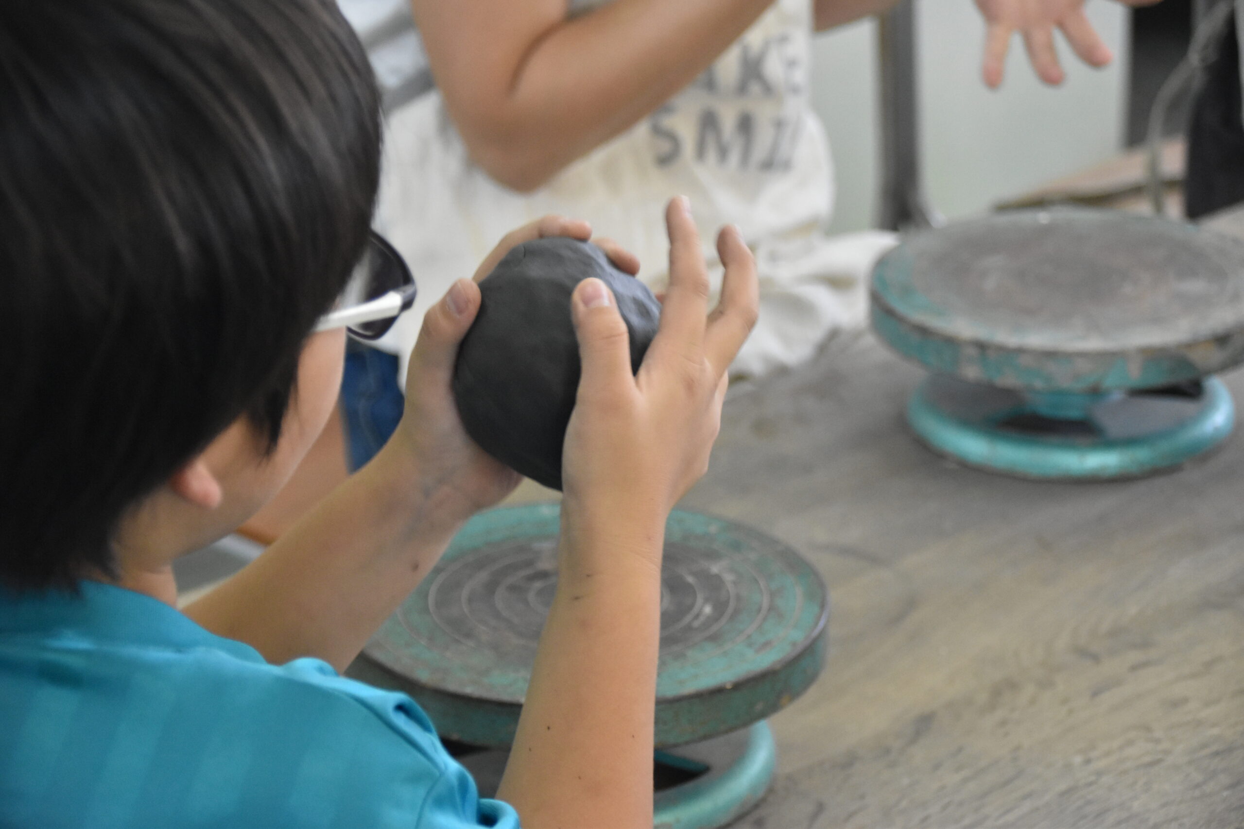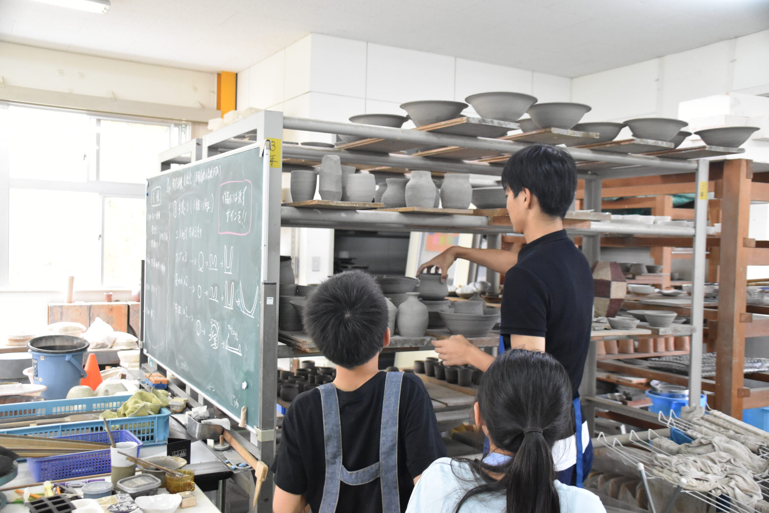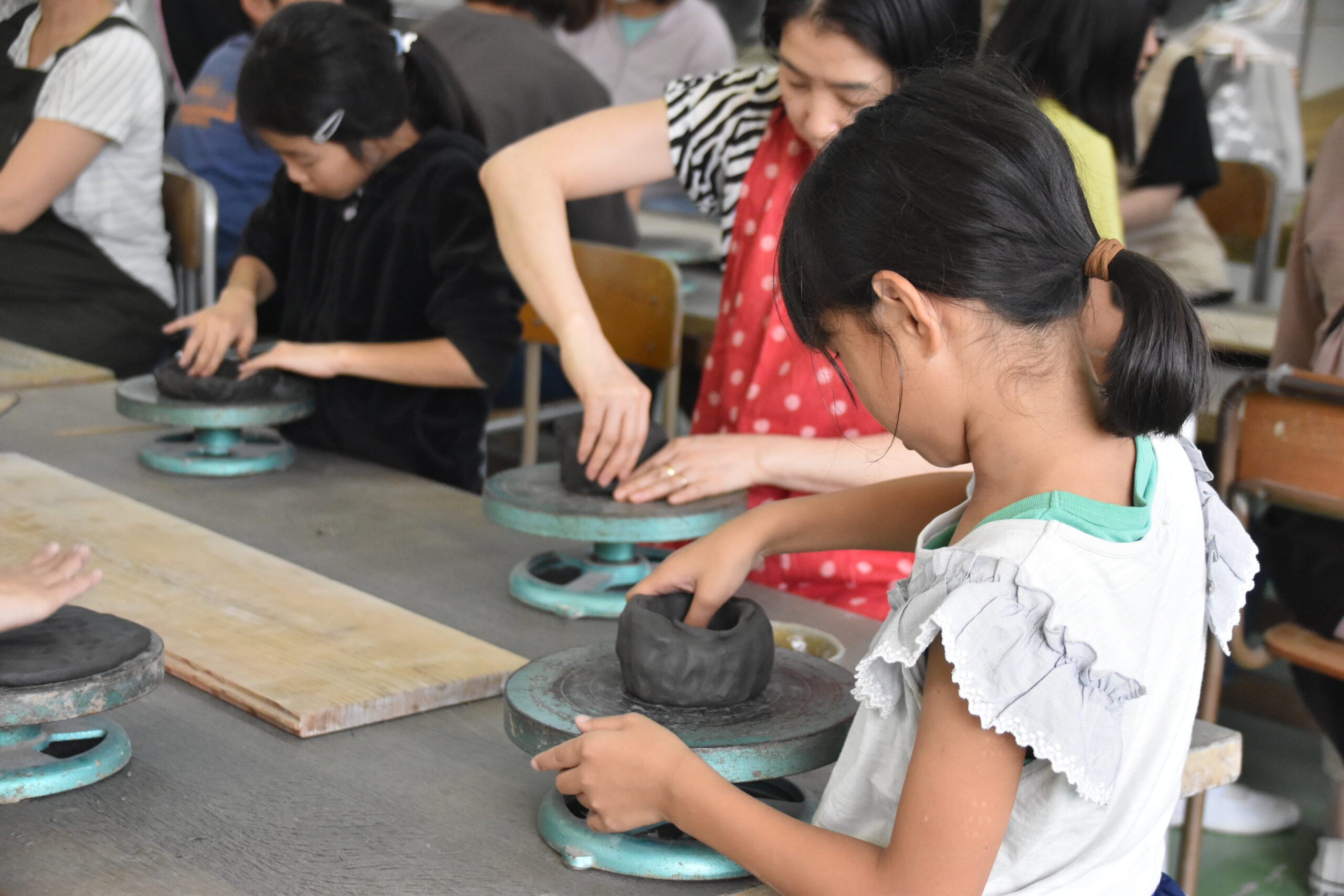 9月24日(火)吉備高原小学校PTA活動「親子陶芸教室」が本校の陶芸教室で行われました。訪れたのは、学校からすぐ近くにある吉備高原小学校の4年生20人とその保護者20人の合計40人。一度に40人受け入れることは珍しく、陶芸教室が満員でした。そこで2グループに分かれてもらい、1つは本校オリジナルブランド「のばら」のカップに絵をつけてもらう”絵付け作業”、そしてもう1つは、”手回しろくろでの制作作業”、約1時間交代で2つの行程を体験をしていただきました。写真では伝えきれなくて残念ですが、子どもたちとお母さん方が本当に楽しそうに過ごしておられました。陶芸コースの生徒達は陶芸をとおして、親子の橋渡しをするとともに、制作の魅力を伝えました。人の役に立っていることを実感し、生徒たちも心豊かに成長していると思います。