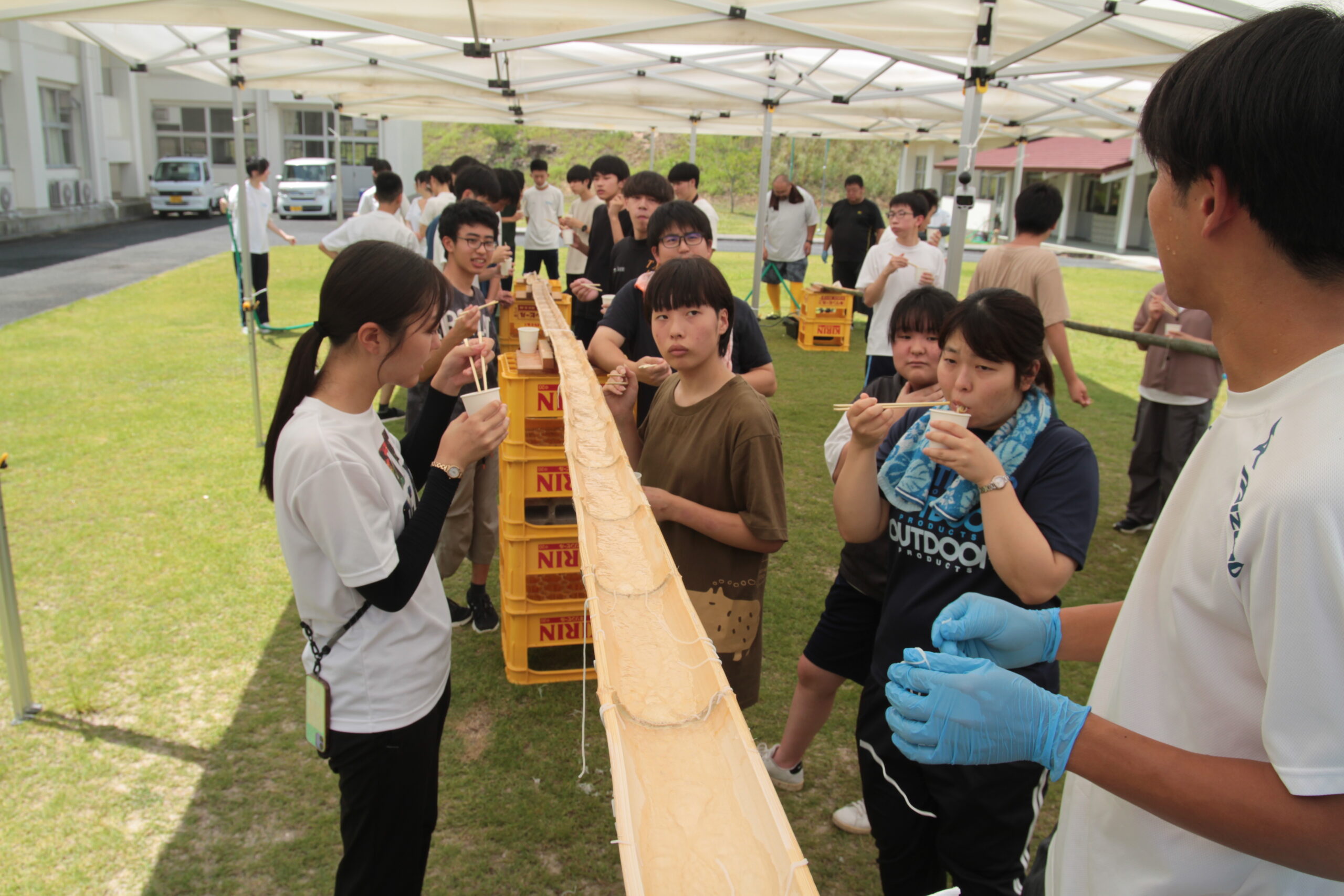 「流しソーメン体験」はみんな初めての体験。教員団は竹を切るところから準備していました。