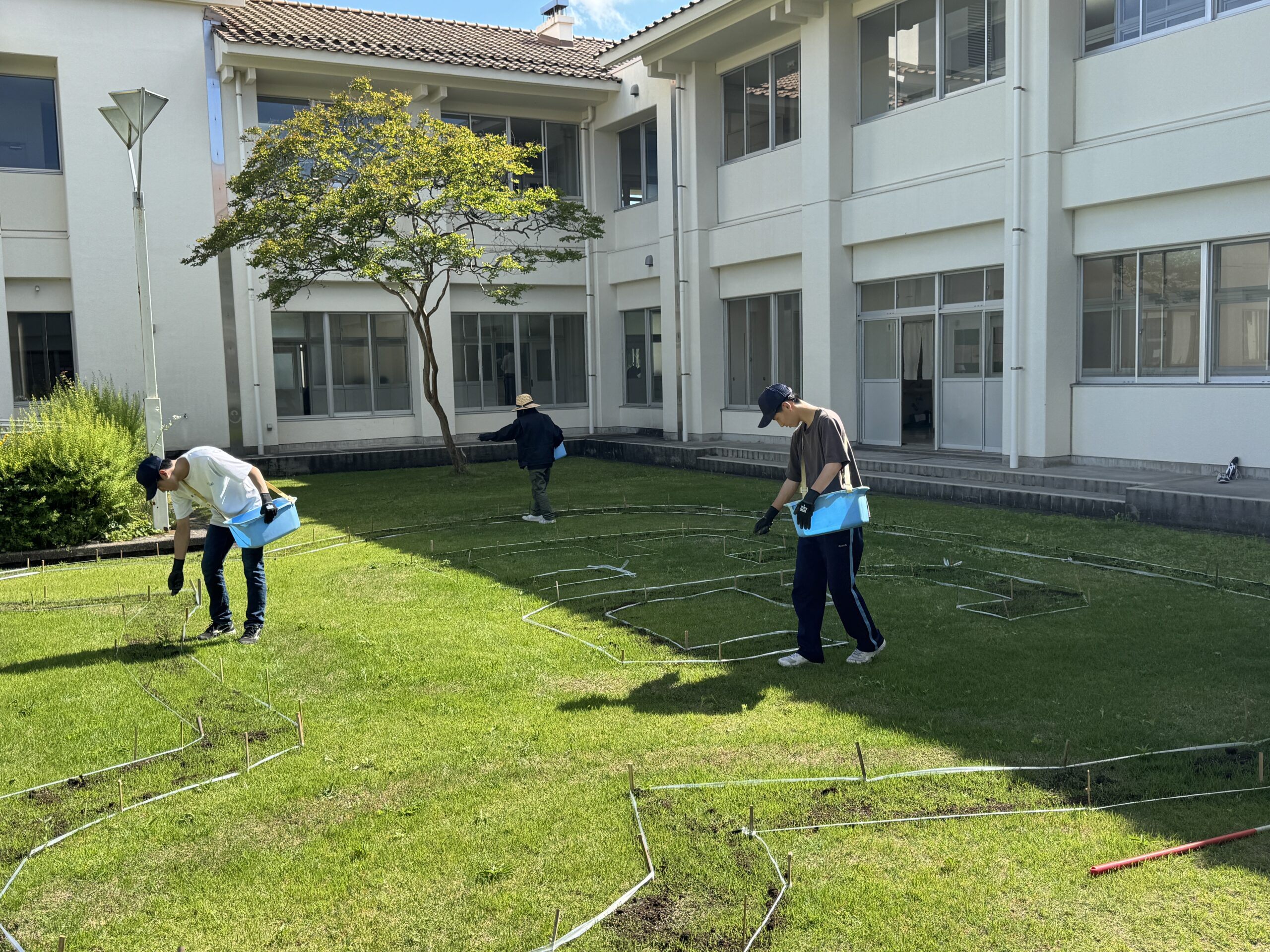 緑化システムコースでは、現在、芝絵の育成作業に取り組んでいます。今回は、絵の一部に肥料をまく作業を行いました。芝絵とは、芝生をキャンバスに見立てて模様や文字を描くもので、成長の過程で絵柄が少しずつ浮かび上がってくるのが特徴です。