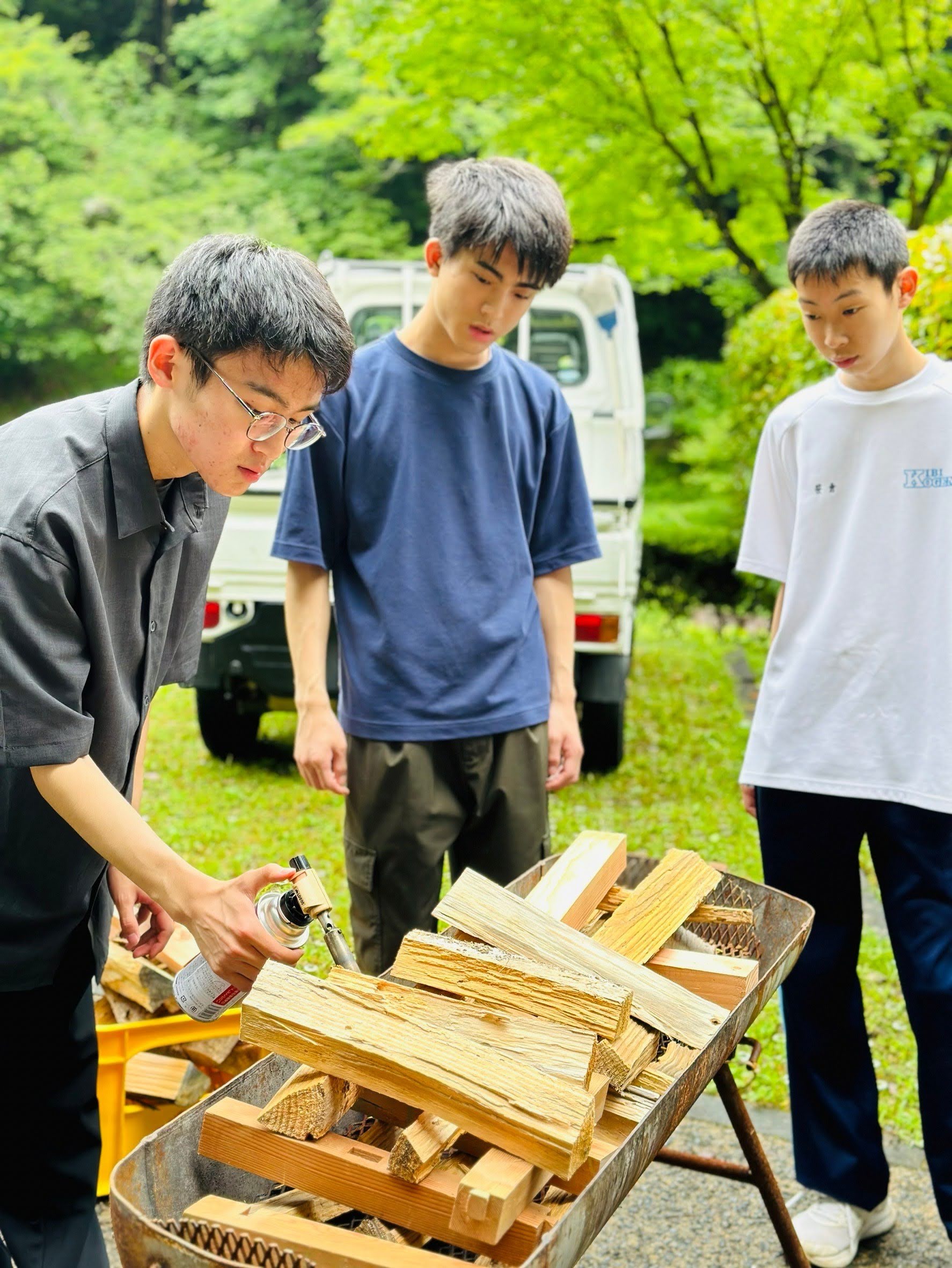 校舎の枯れ松を昼休みに薪割りし、キャンプファイヤーの燃料に。