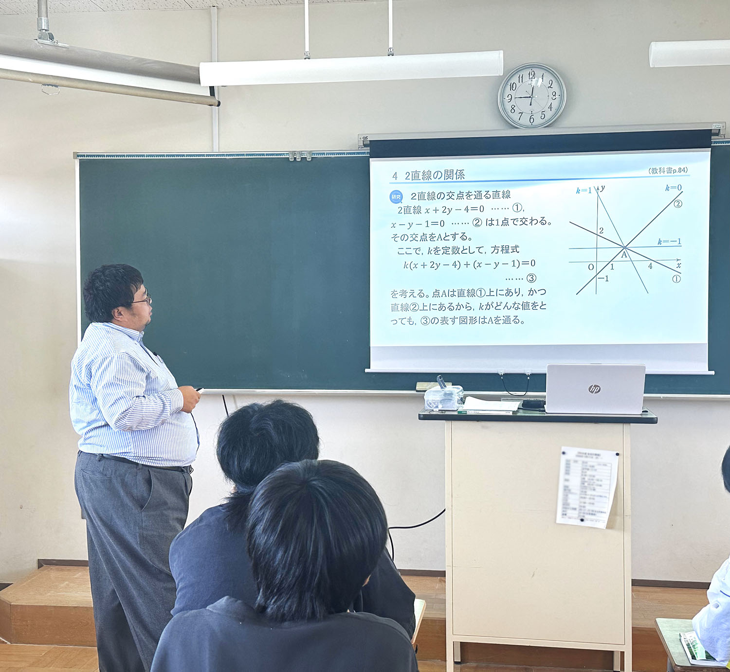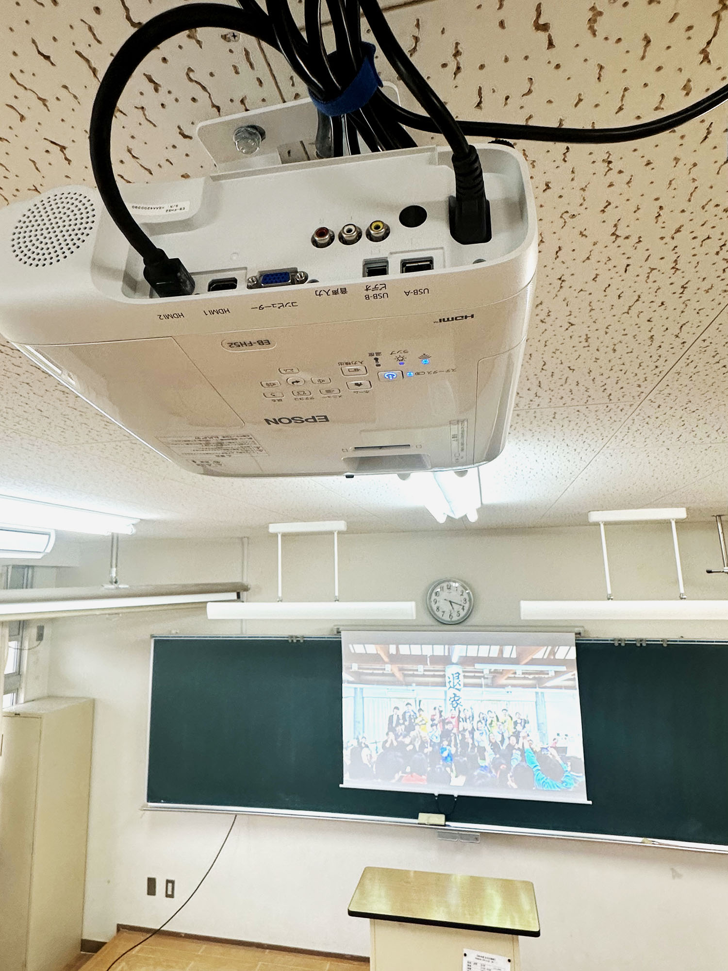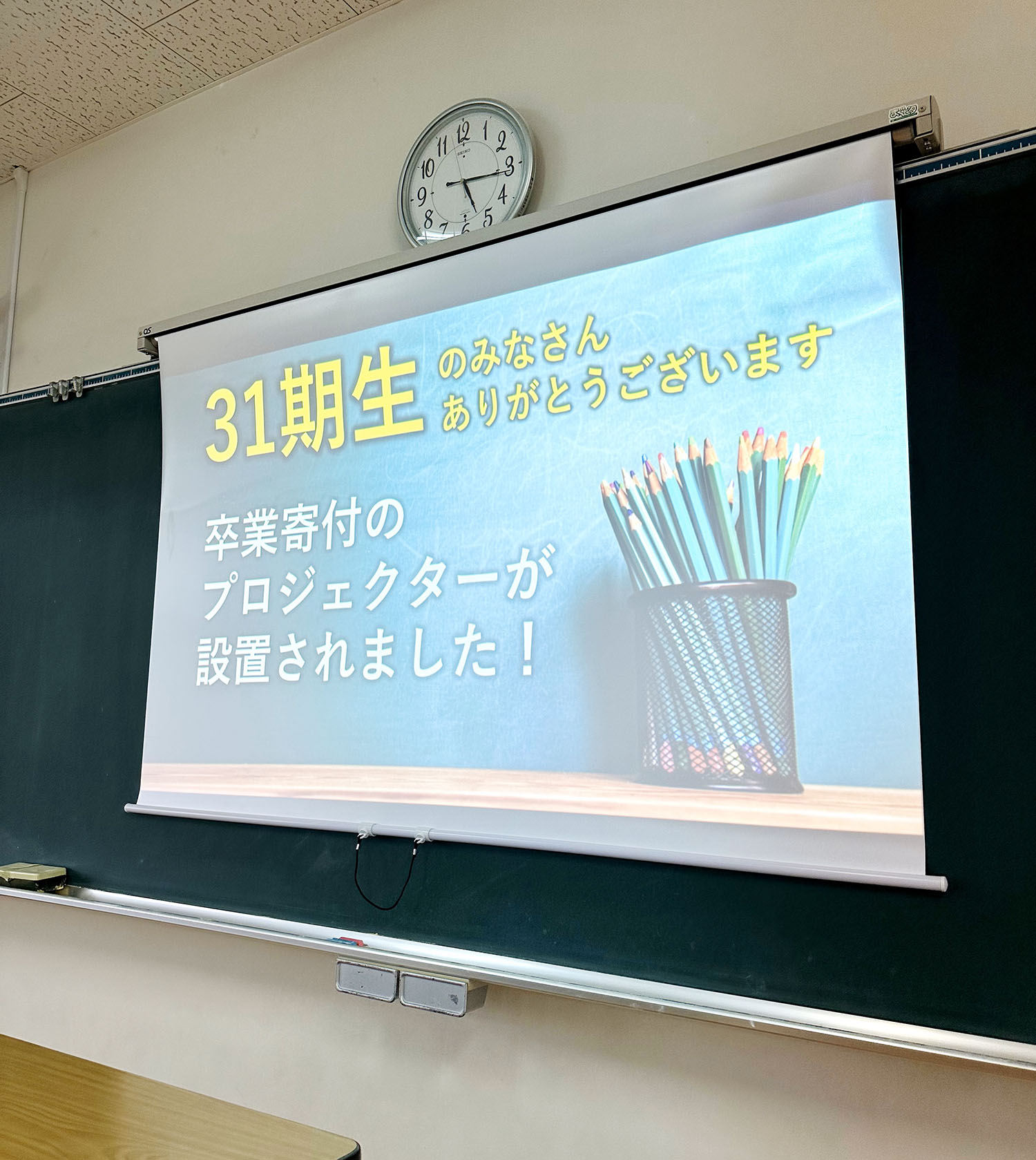 今年の春に卒業した31期生のみなさんからの卒業寄付によって、5月20日に新しいプロジェクターとスクリーンが設置されました!場所は2年生が使用している3階の3教室です。とにかく明るく鮮明なので、日中でも投影された教材や画像がくっきりと見えます。数学を教える犬飼先生も授業では絶好調です!