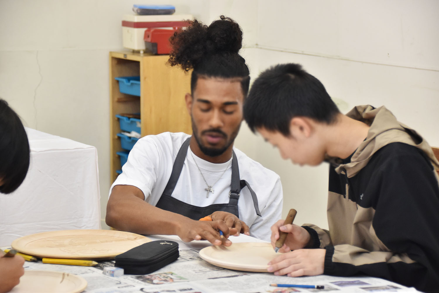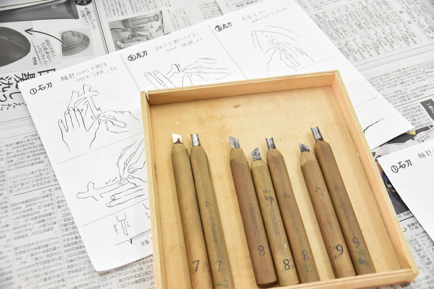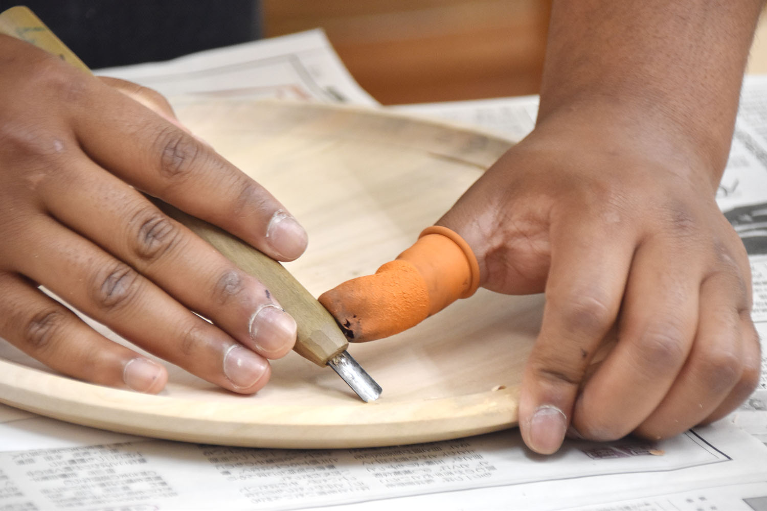 1年生の『専門基礎』の時間に、クラフトデザインコースの特別講義が行われました。1年生は基礎的な知識やスキルが身についていないため、恐る恐る彫刻刀を握っていましたが、ものづくりの楽しさや自分の作品が長く残ることへの喜びなどを講師の先生方から学んだと思います。