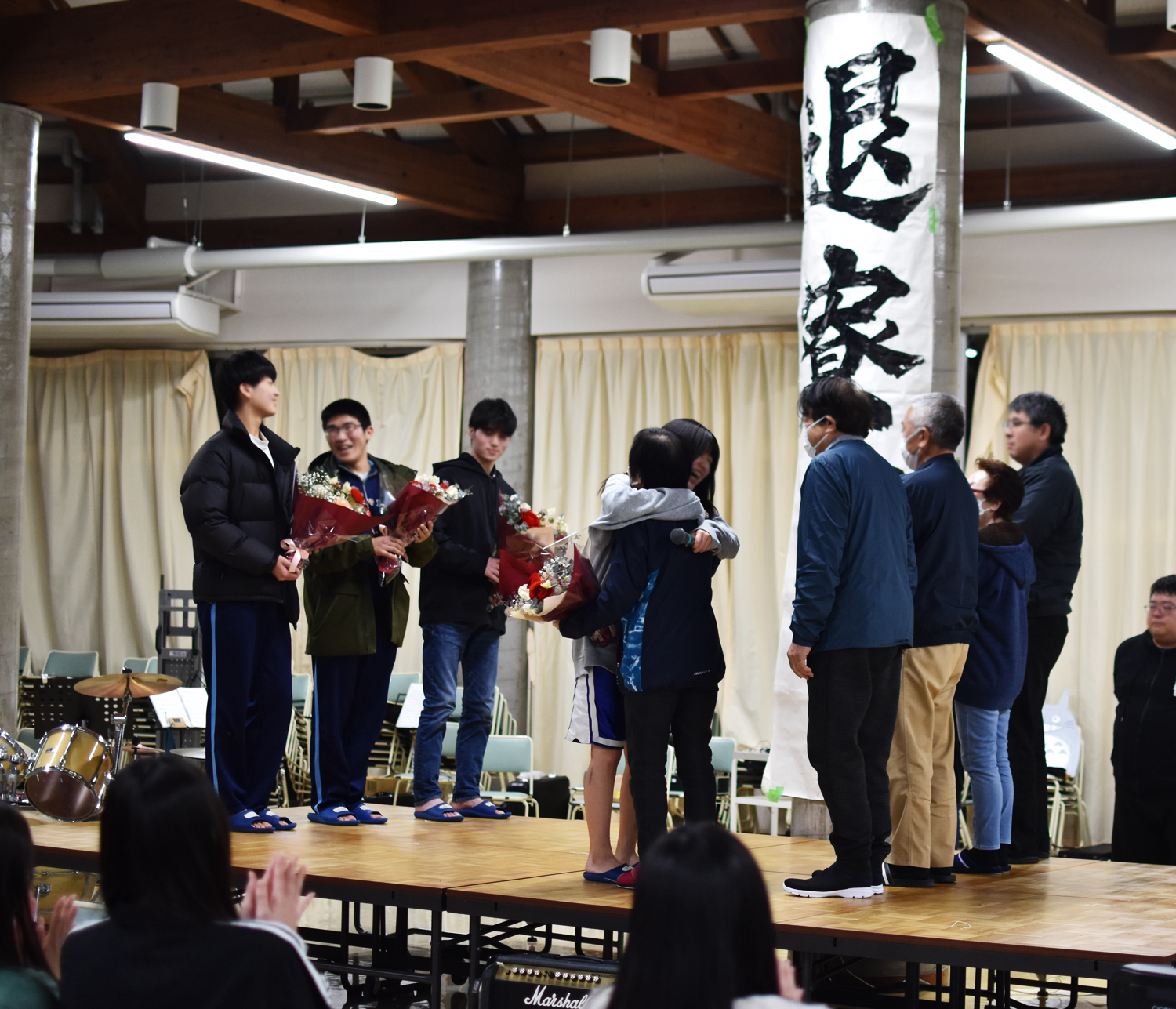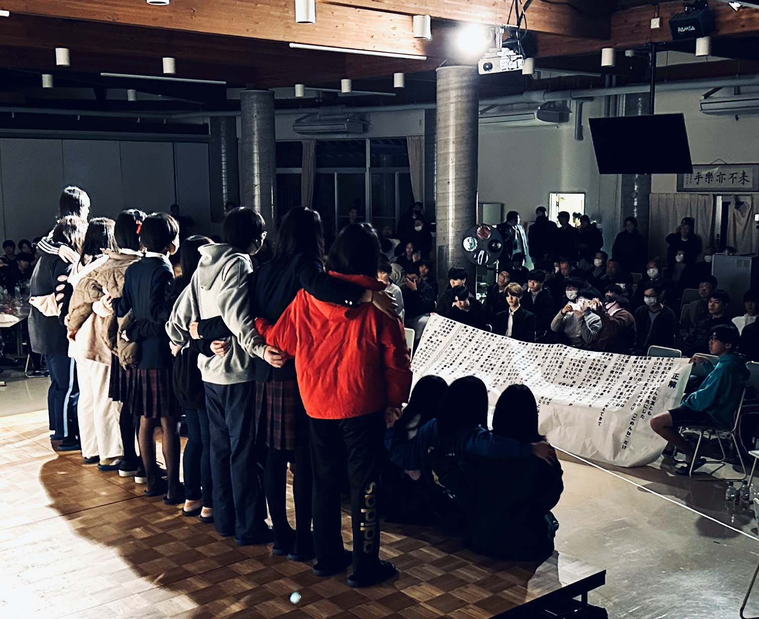 3年生にとって最後の寮行事である「退寮式」が2月29日(木)に開催されました。新型コロナウイルスの影響もあり、様々な場面で苦労し続けた3年間でしたが、夕食後、全員が食堂に集まり19:30~22:00の間、盛大に盛り上がりました。音楽部、ダンス同好会、演劇部は3年生も含めたメンバーで最高のパフォーマンスを披露してくれたり、3年生の有志が「正解」(RADWIMPSの曲)を熱唱したりと、3年生自身も退寮式に積極的に参加し、楽しんでくれていました。また、教職員によるパフォーマンスでは、会場全体の雰囲気も最高潮に達し、涙と笑顔が溢れていました。