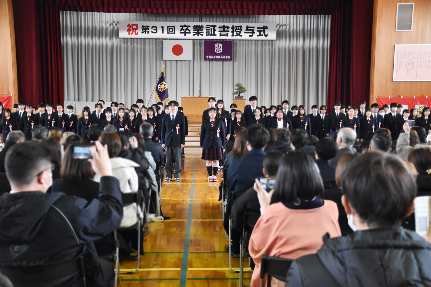 第31回卒業証書授与式の日を迎えました。晴天に恵まれたものの、気温は氷点下まで下がり、冬に戻ったかのような朝でしたが、数年ぶりに制限なしの卒業式ということで、卒業生の保護者の皆さまはもちろん、多くのご来賓の方々にもご出席いただき、盛大に卒業生の門出を祝うことが出来ました。