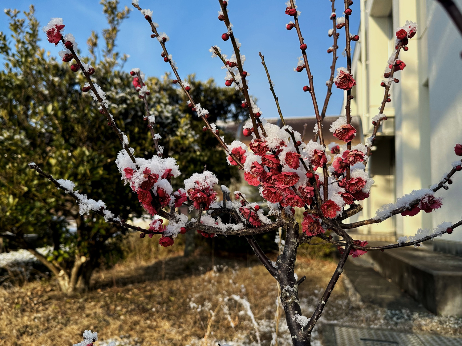 咲いたばかりの紅梅も雪をかぶってしまいました