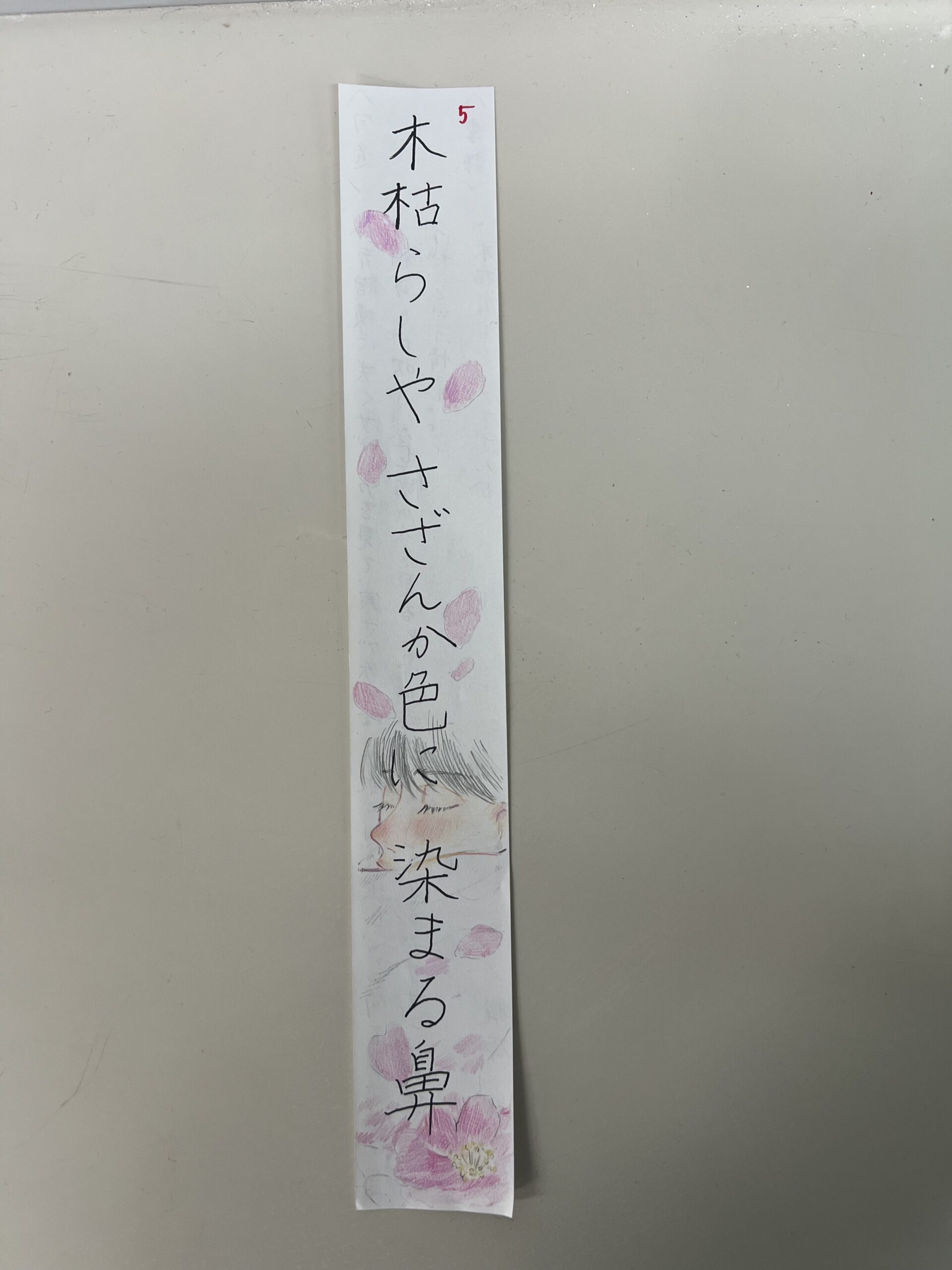 それぞれ、校内で撮れた写真を一枚選び、そこから句を考えるものでした。季語を入れることを条件としていたので、苦戦している生徒もいましたが、みんな楽しそうに作っていました!!