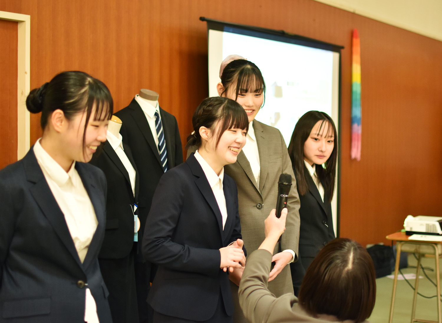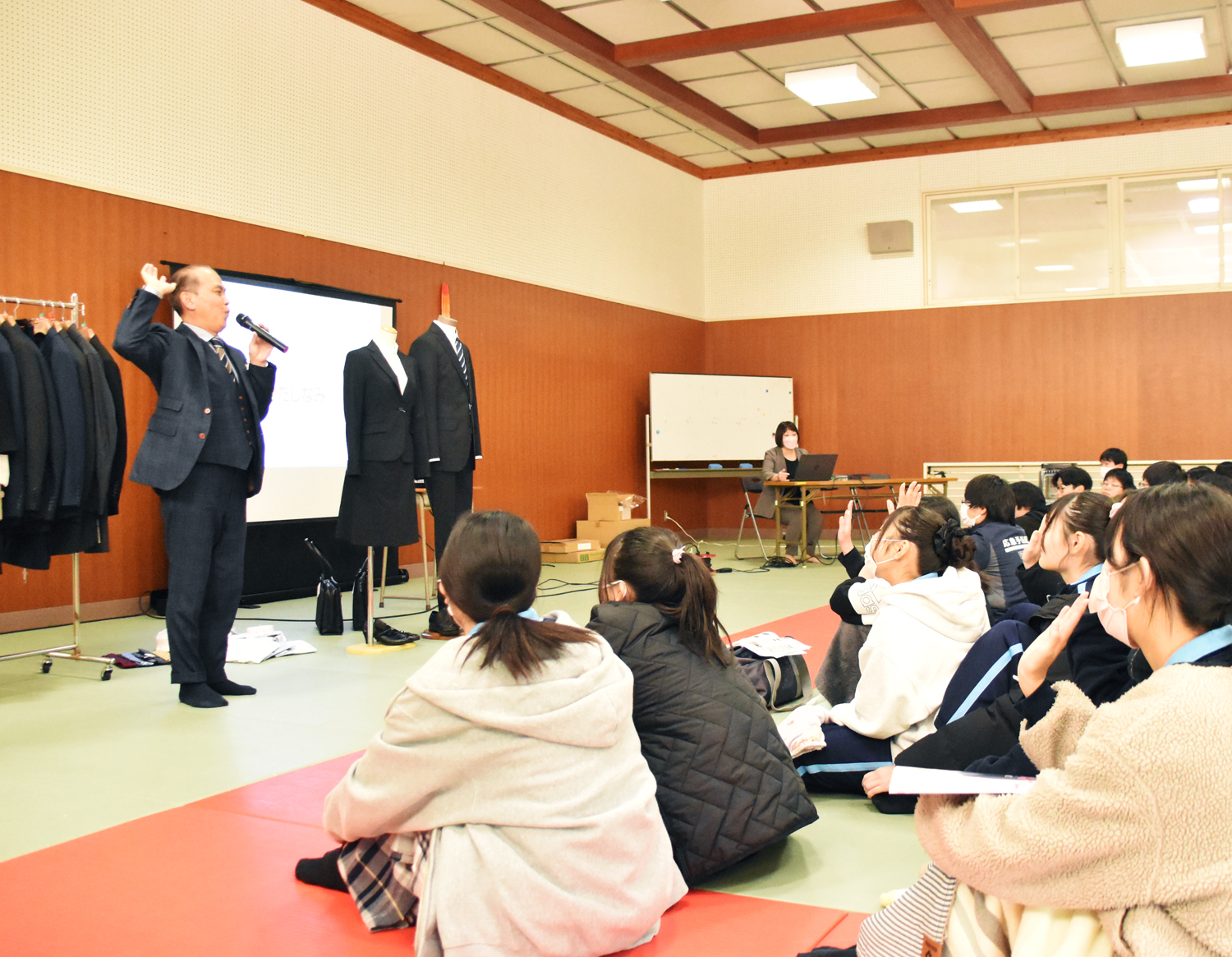 3年生は、卒業後に備えて?「スーツ着こなし講座」を行いました。「洋服の青山」で知られる青山商事株式会社様から講師の先生をお招きして、スーツにまつわる基礎知識から着こなしのポイントまで教えていただきました。ネクタイの結び方では苦戦していた生徒多かったようですが…
