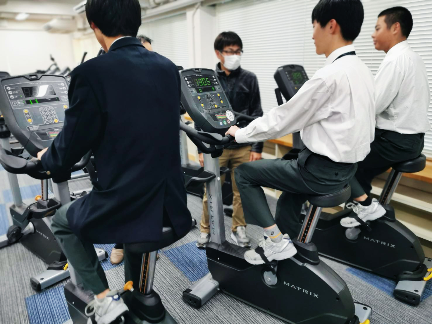 【スポーツ社会学科】では、握力測定がありました。と言っても「足の握力」です!また、エアロバイクの体験では6kmもペダルをこぎましたよ!