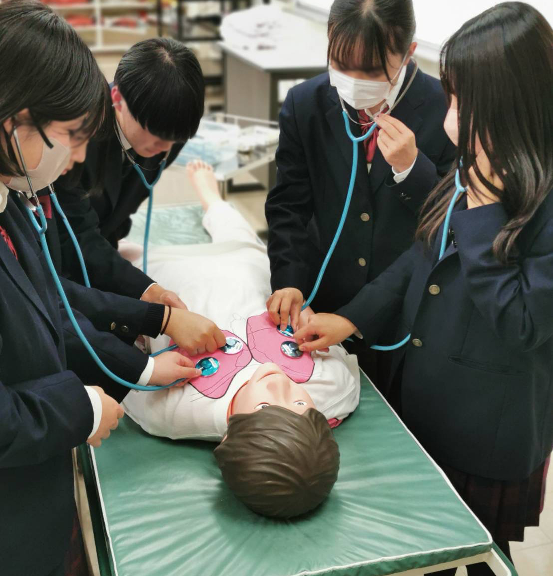 【看護学科】では、聴診器で病気の時の心臓音を聞くという体験をすることが出来ました。実際の患者さんの心臓音を聞くことは出来ませんが、大学の設備を使えばそれも可能なんですね!