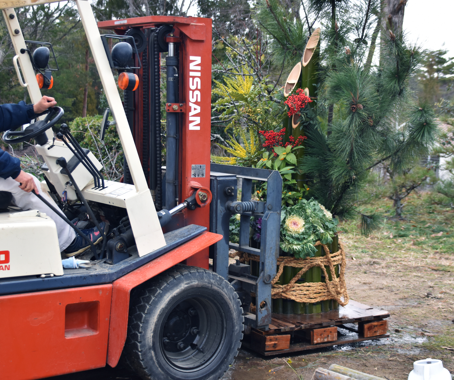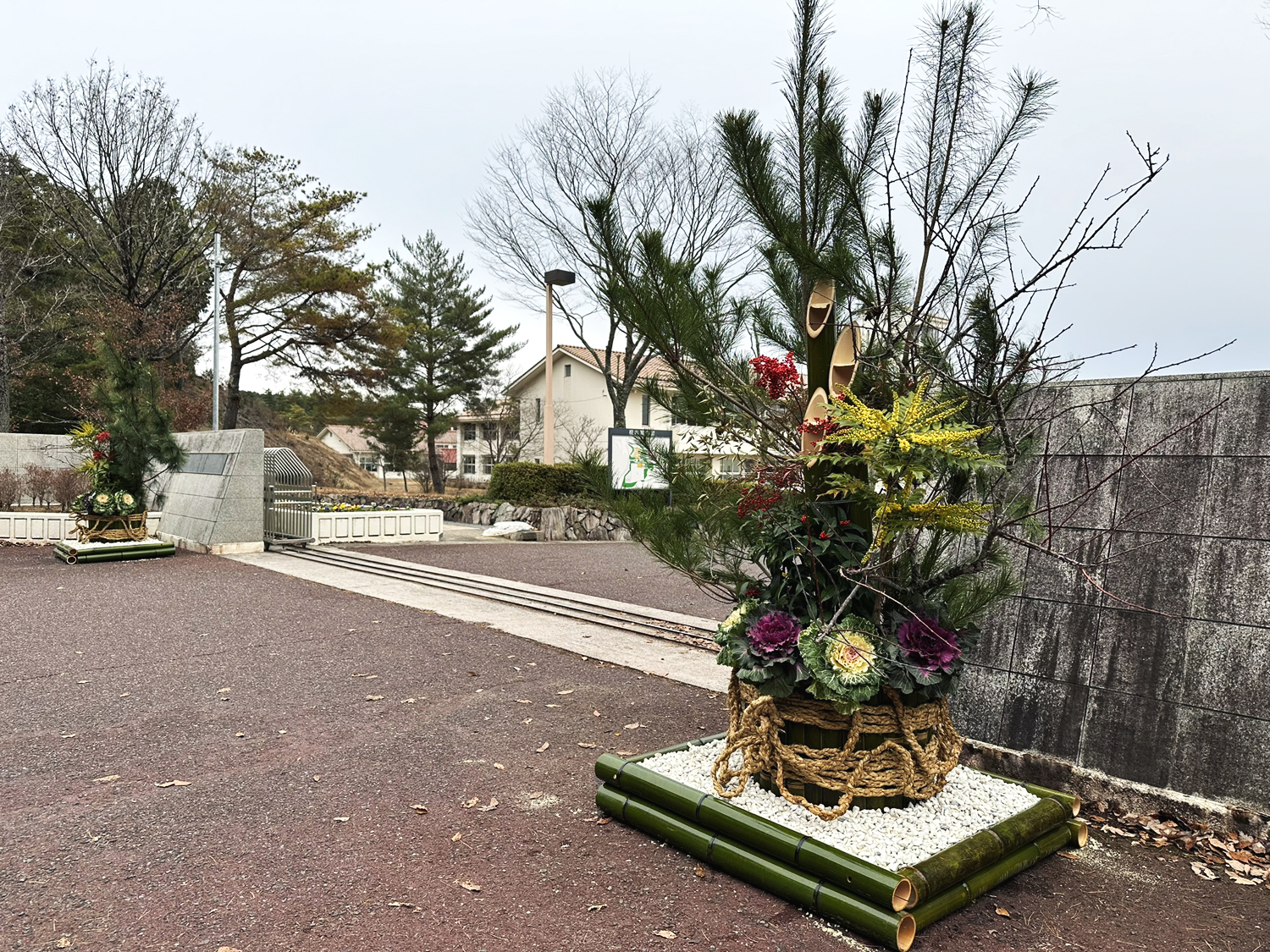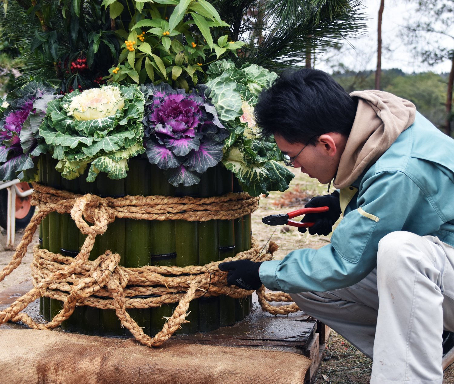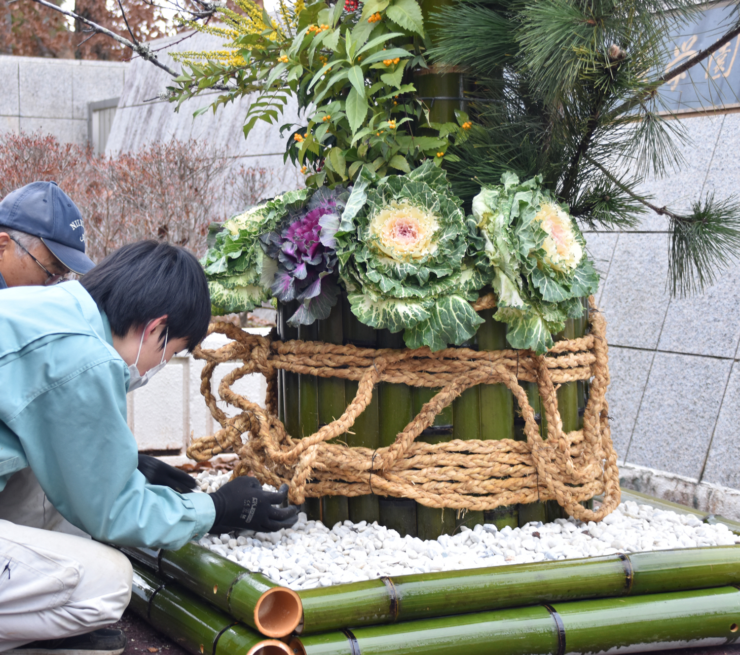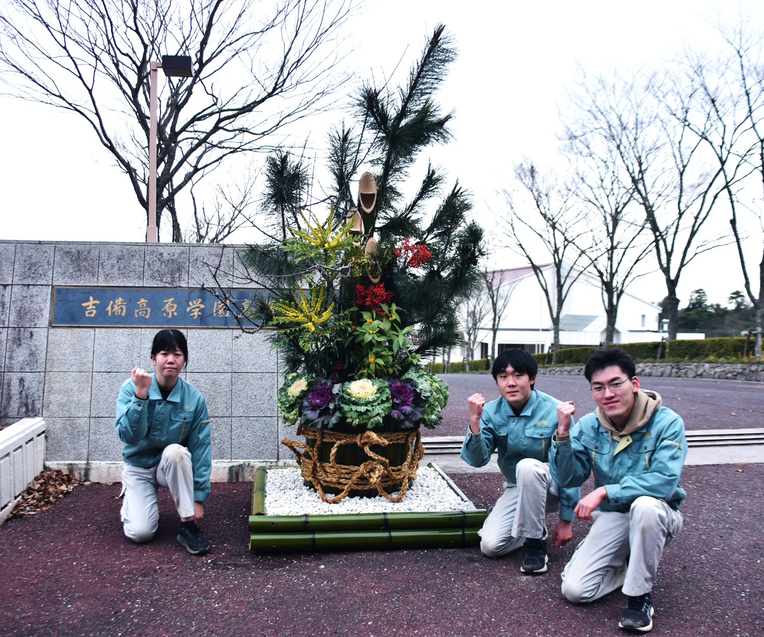 本日、緑化システムコース3年生の卒業制作である「門松」が完成しました。時折、雪がチラつく中での作業でしたが、3年生3名が丁寧に仕上げ作業に取り組みました。岡山県内でもナンバー1ではないかと思うほどの出来栄えですので、ご来校の際にはぜひご覧ください!
