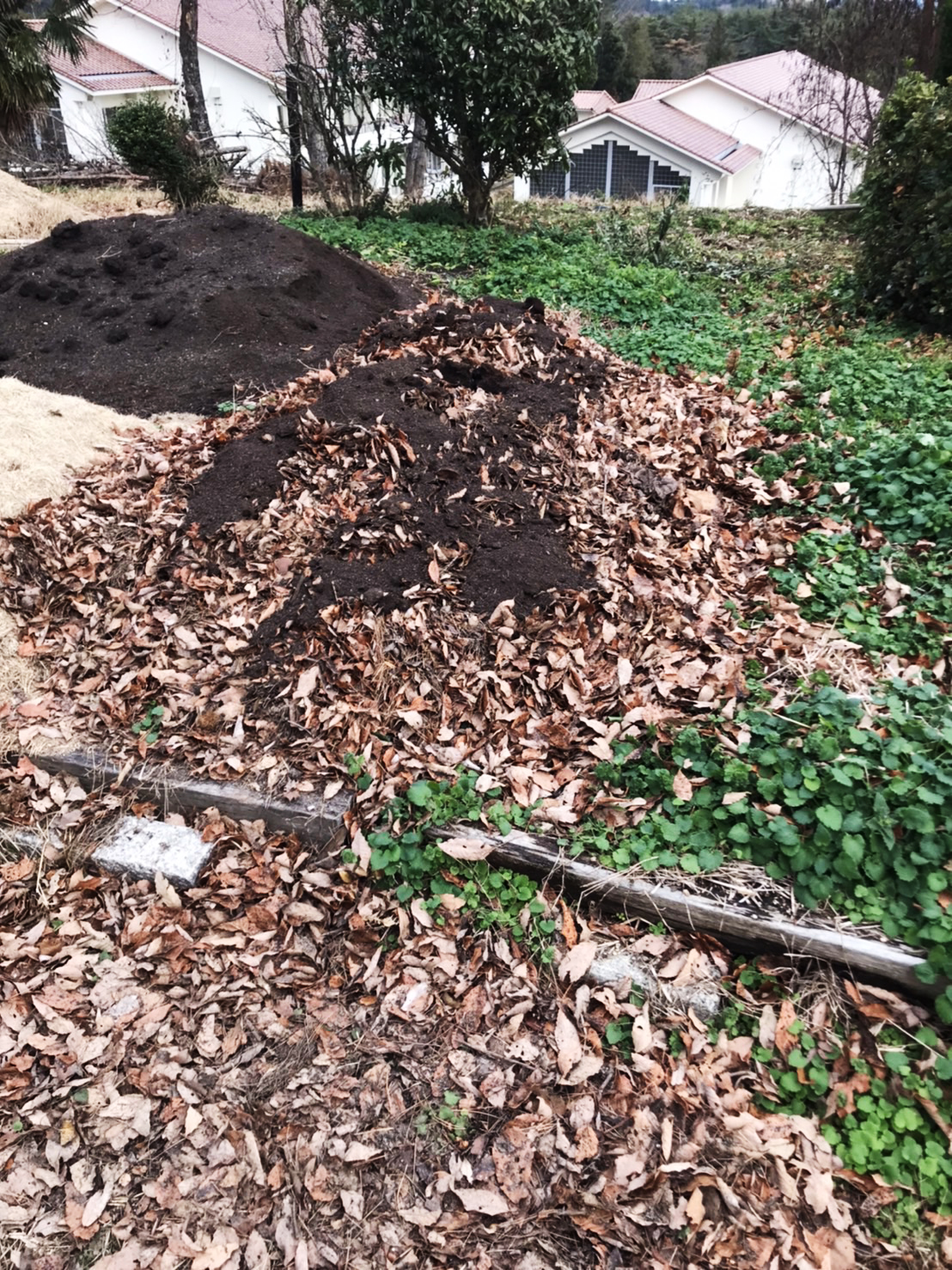 12月16日(土)1年生3名が校門前から近くのバス停までの沿道の落ち葉を集めました。集めた落ち葉は3時間で軽トラック1台分以上!実習棟裏にある苗床と裏山に運んで、土をかぶせると腐葉土になります。豊かな土になって「漆の木」の栄養分になります。