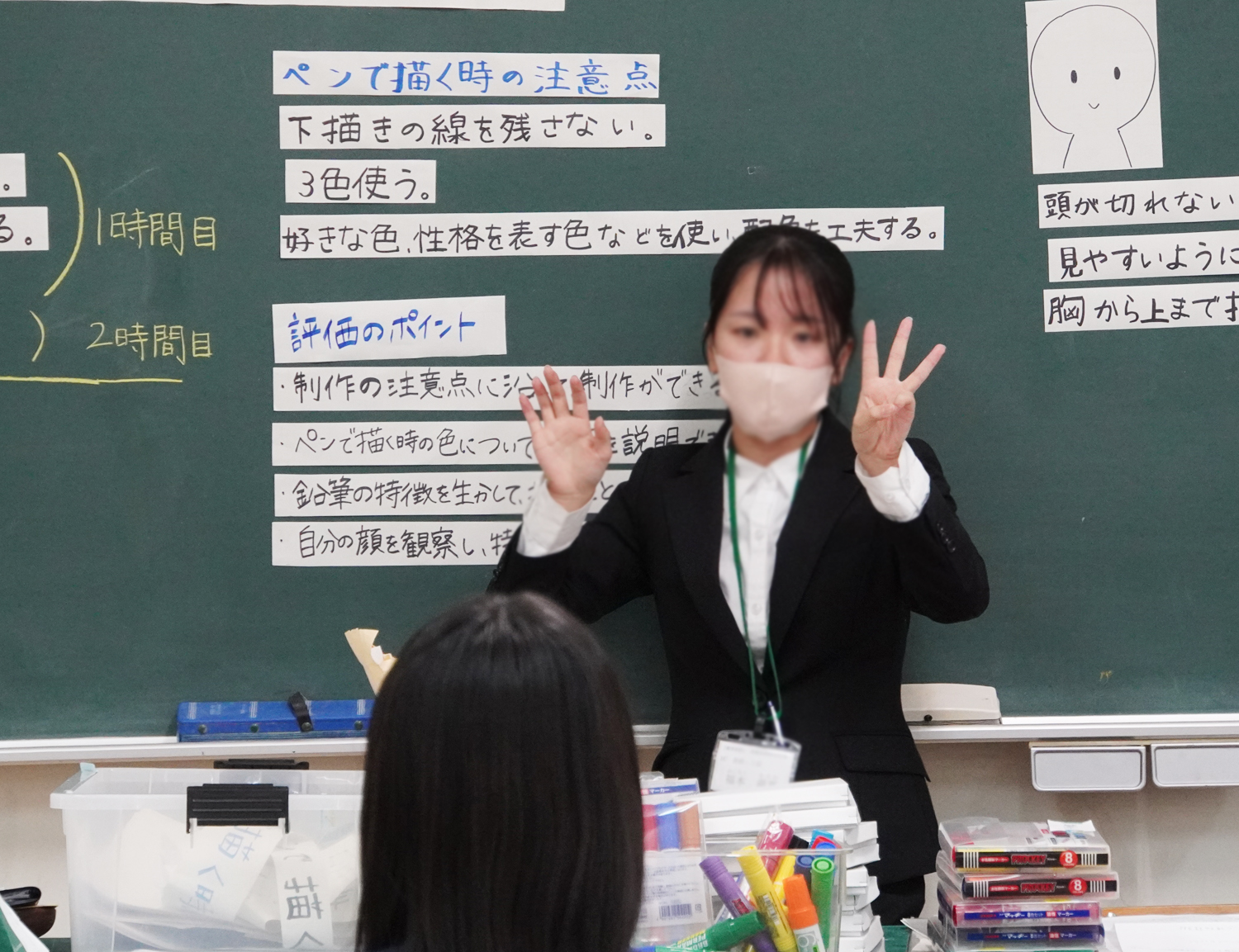 教育実習3日目にして、早くも実習生による授業が行われました。2時間連続の1年生美術の時間でしたが、指導案通りに出来たのでしょうか?実際の授業では必ずしも予定通りの展開にならないこともありますので、2週間の間に臨機応変に対処する力も身に付けていきましょう!