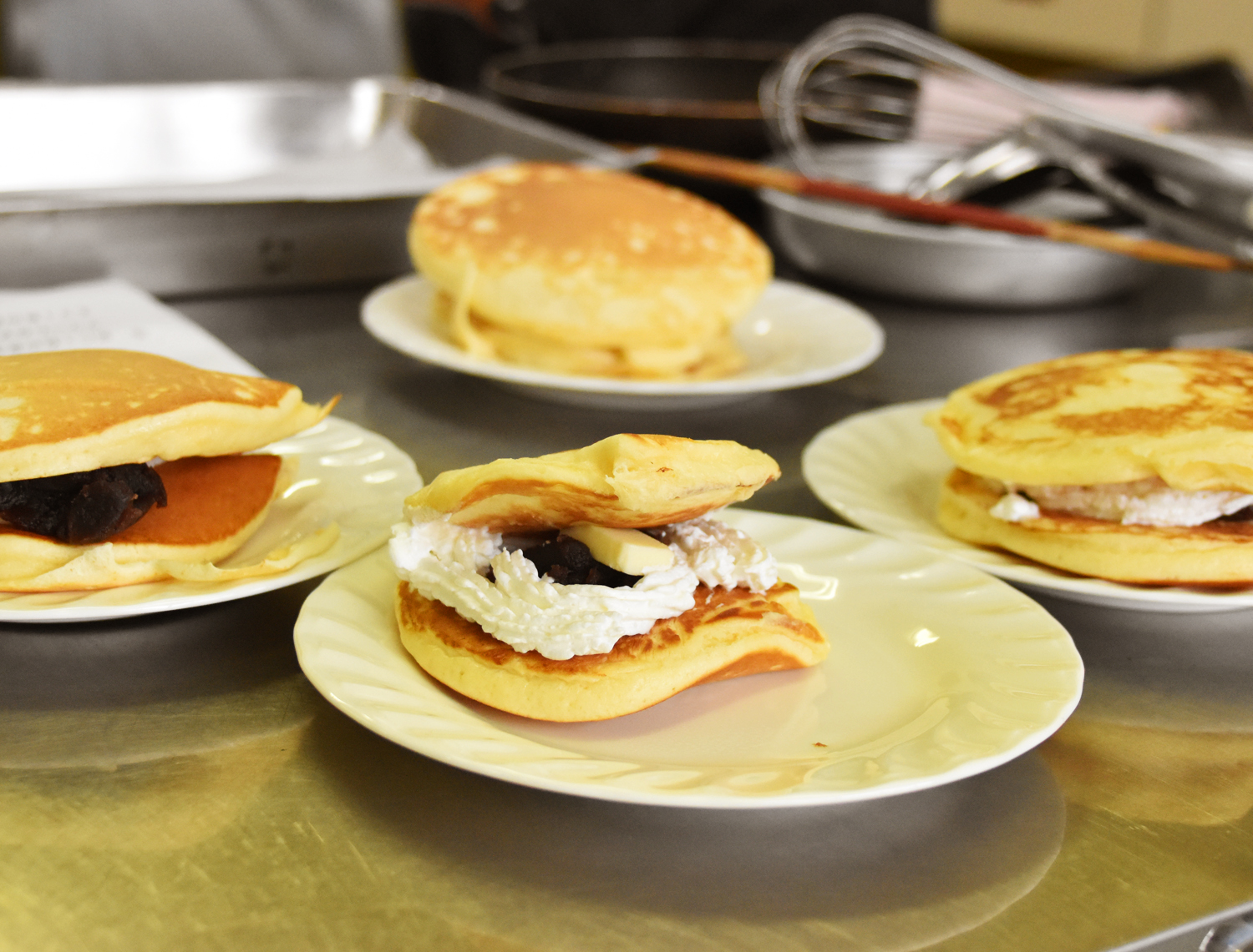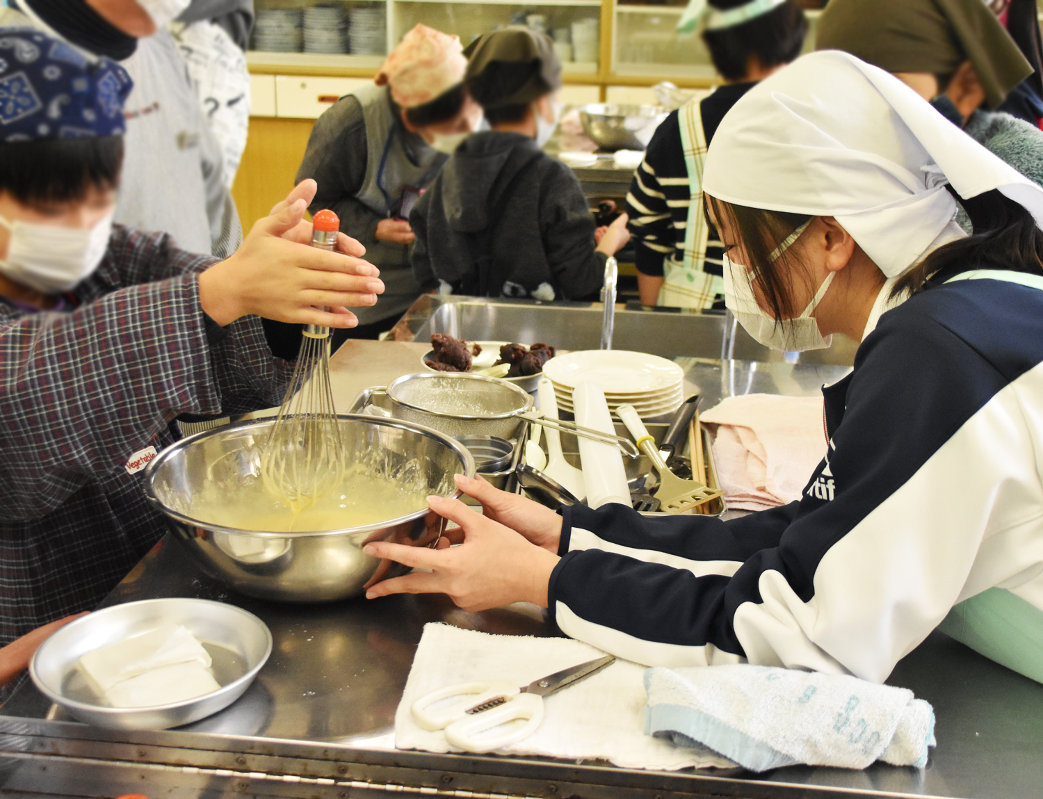 本日、「吉備高原のびのび小学校」の皆さんが来校されて、福祉ボランティアコースの生徒たちと調理実習を行いました。フライパンでホットケーキを焼き上げ、あんことクリームを挟んで「どら焼き」の出来上がり!ボリュームたっぷりのおやつに参加した皆さんは笑顔でいっぱいでしたよ!