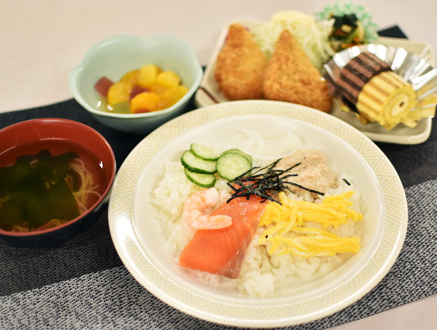 本日の昼食は洋風ちらし寿司、ミルフィーユカツ、辛子和え、そうめん汁にデザートという「スペシャルメニュー」です!メインの「洋風」ちらし寿司の正体は、サーモン・錦糸卵・エビ・キュウリ・ツナマヨでした(洋風なのか?)。とてもさっぱりしていて食べやすかったですよ。デザートのロールケーキも嬉しいですね。