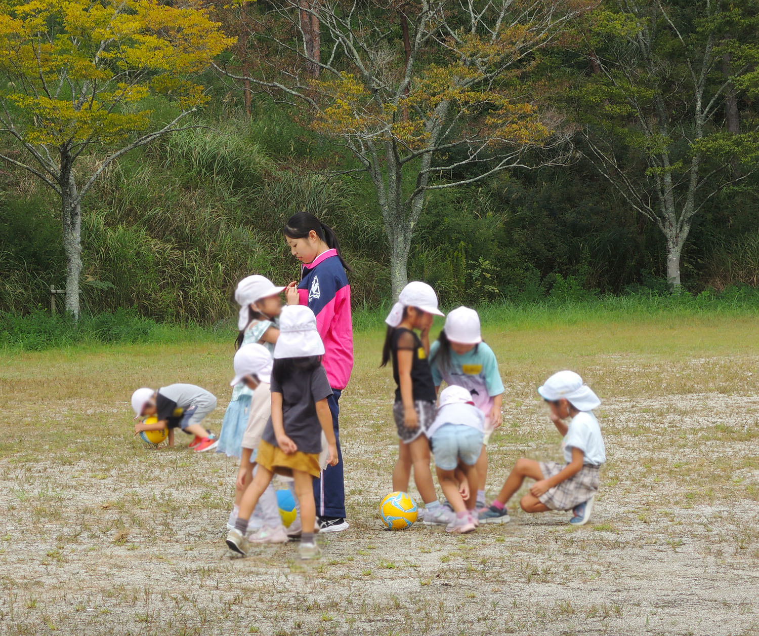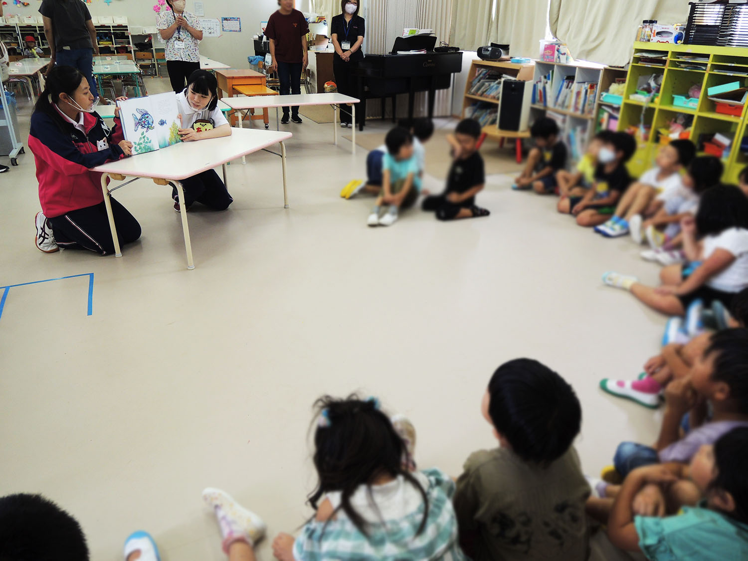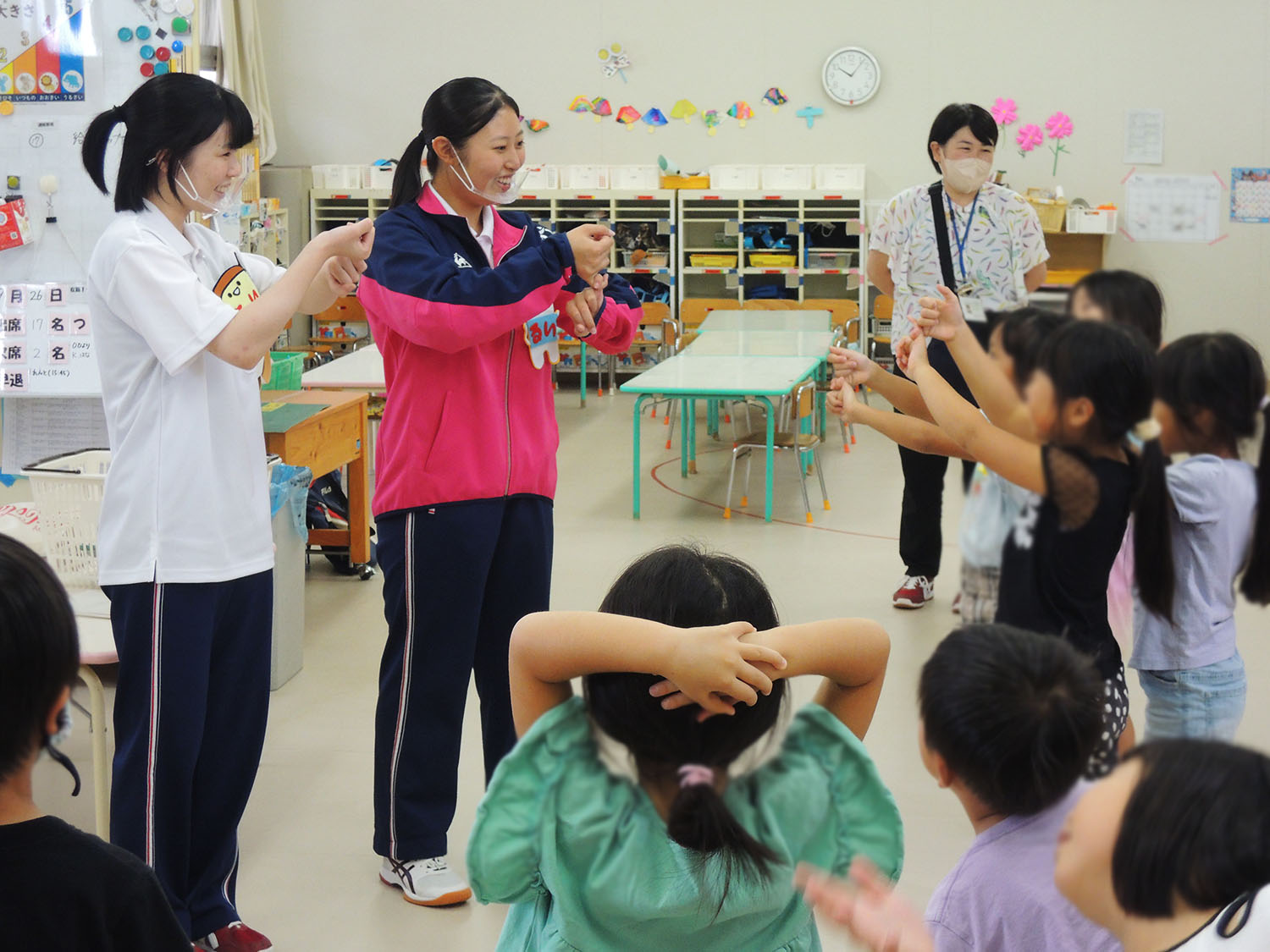 福祉ボランティアコースの校外研修報告です。9月26日(火)今年度2回目となった吉備高原子ども園への訪問実習です。当日は手話歌『虹』、公園へのお散歩や自由遊び、絵本の読み聞かせ『にじいろのさかな』、給食・お昼寝のお手伝いなど盛りだくさんの内容で、いつも元気な3年生の2人も子供たちのパワーに圧倒されていました。