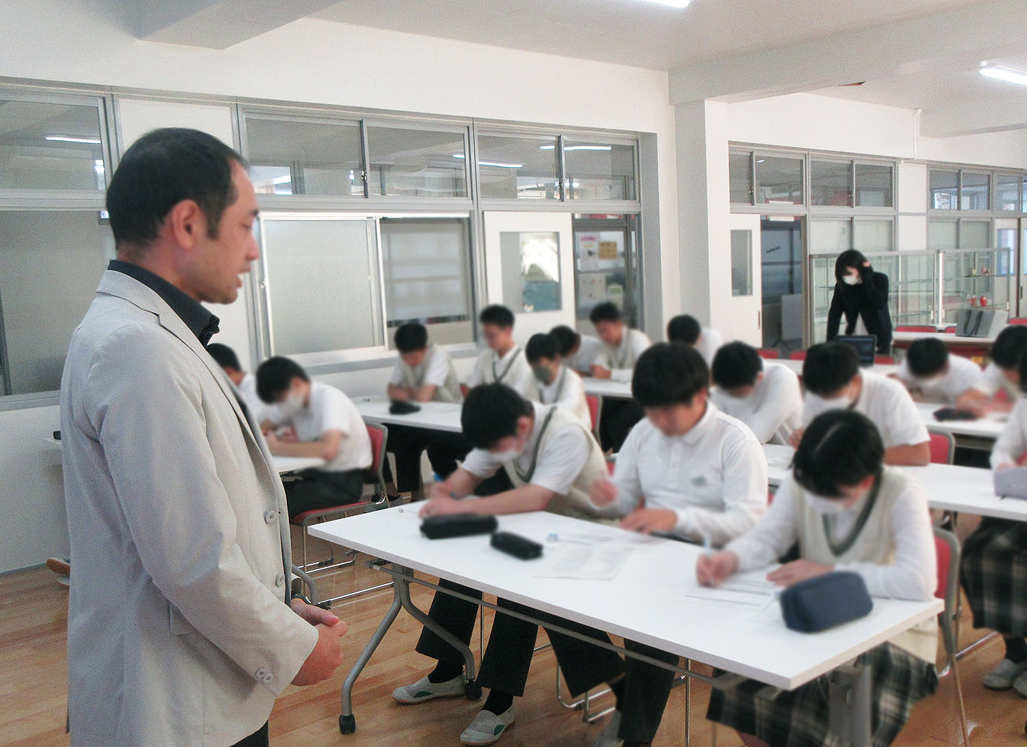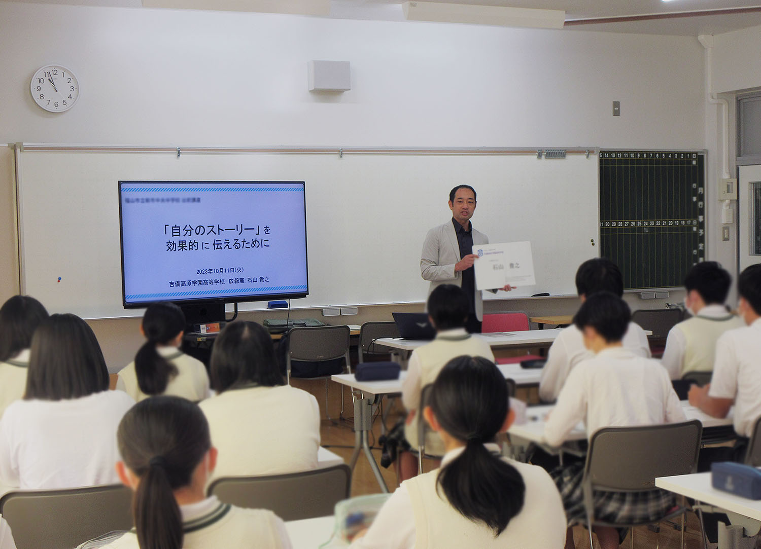 広島県福山市の公立中学校からの依頼で、本校の石山先生が講師として出前授業を実施しました。広島県では、昨年度の中学3年生から高校入試改革が実施され、面接の代わりに「自己表現」が導入されました。本校の「同袍ゼミ」で「プレゼンマスターへの道」という講座を担当している石山先生が、日頃のノウハウを活かして、「自分のストーリーを効果的に伝えるために」という出前授業を行いました。受講した中学3年生(4クラス-約130名)の皆さんは、高校受験にも役立てることが出来るとあって、とても熱心にノートを書きながら参加していました。
