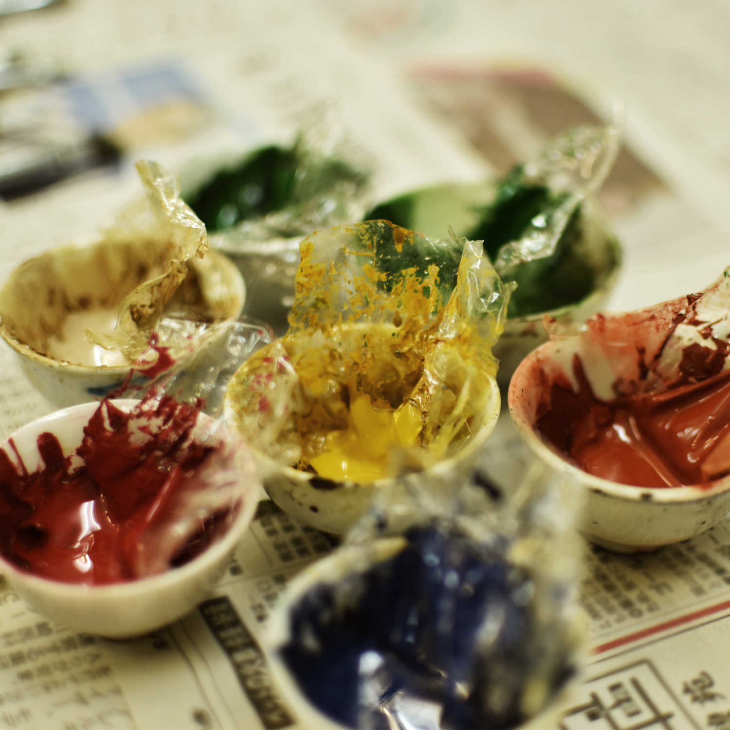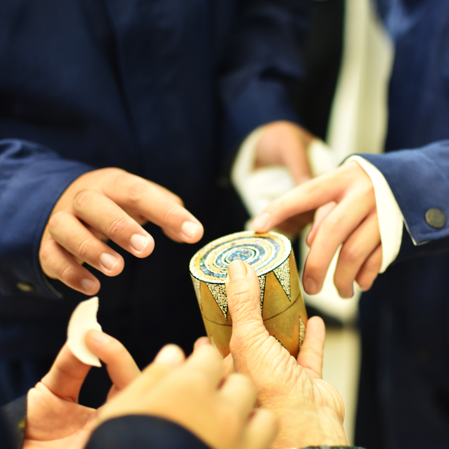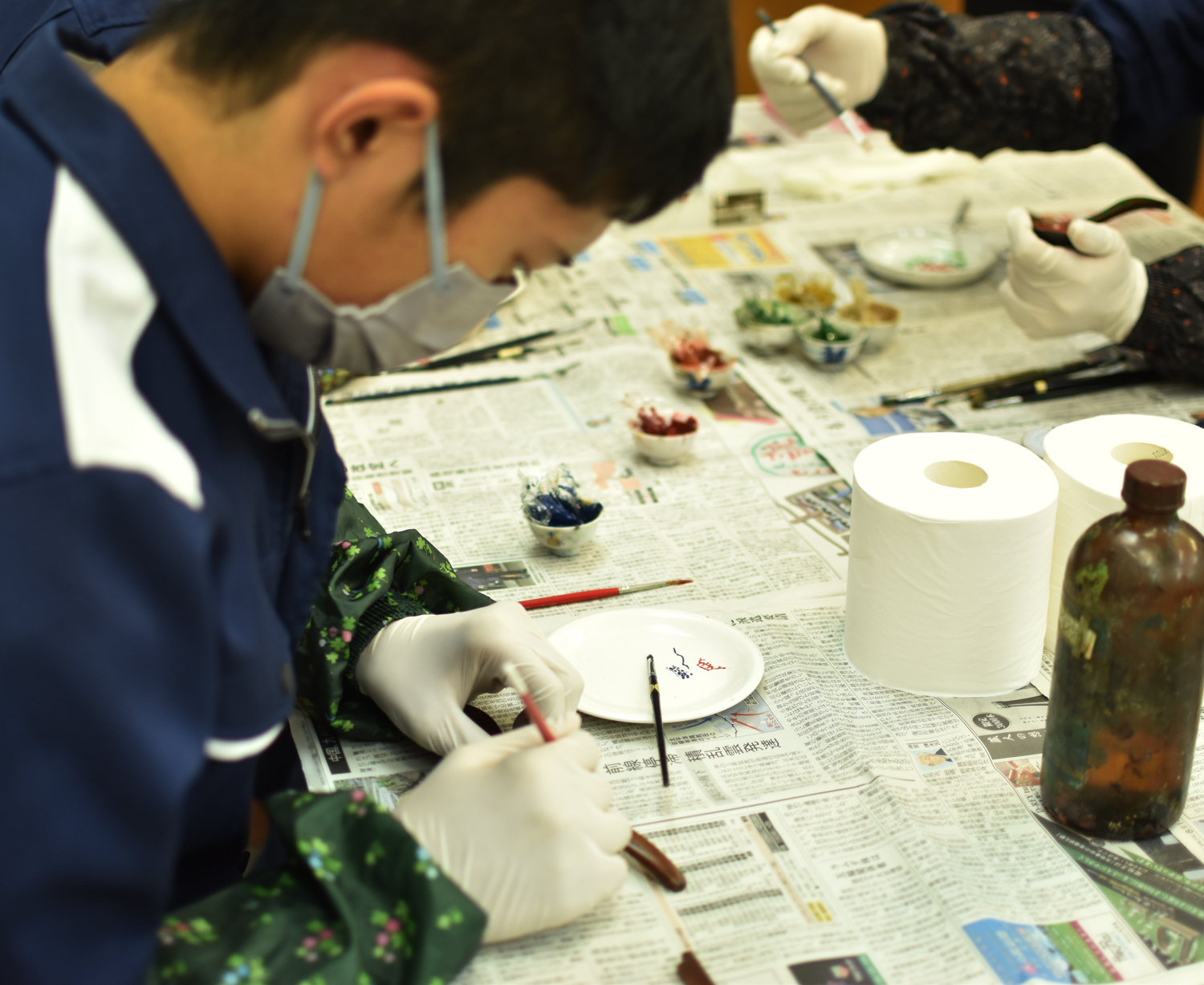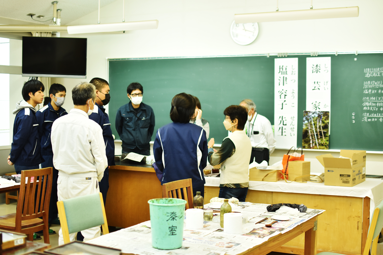 クラフトデザインコースの実習に漆芸家(しつげいか)の塩津容子先生に来ていただき、特別授業をしていただきました。漆器についての基礎知識はもちろんですが、塩津先生がどのような活動をされているかなどの話も聞かせていただきました。また、「螺鈿(らでん)」を施した先生の作品も見せていただきましたが、生徒たちは目を輝かせて見つめていました。その後のワークショップでは、実習の時に作成していた木製の箸とスプーンに「色漆」で思い思いの絵柄を描きました。