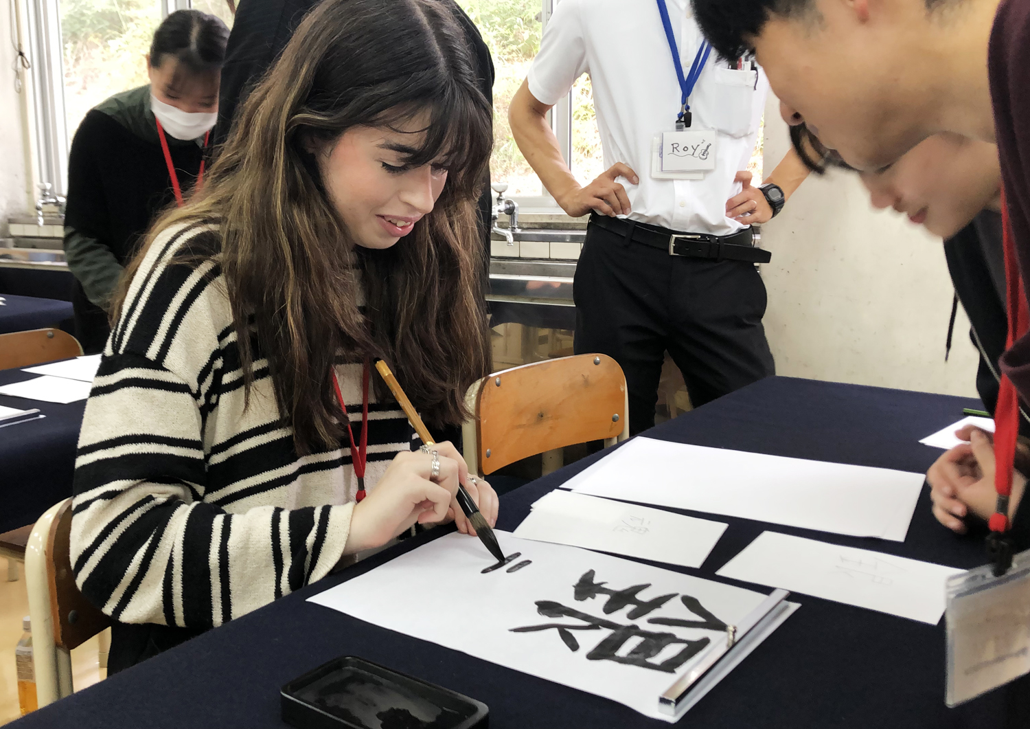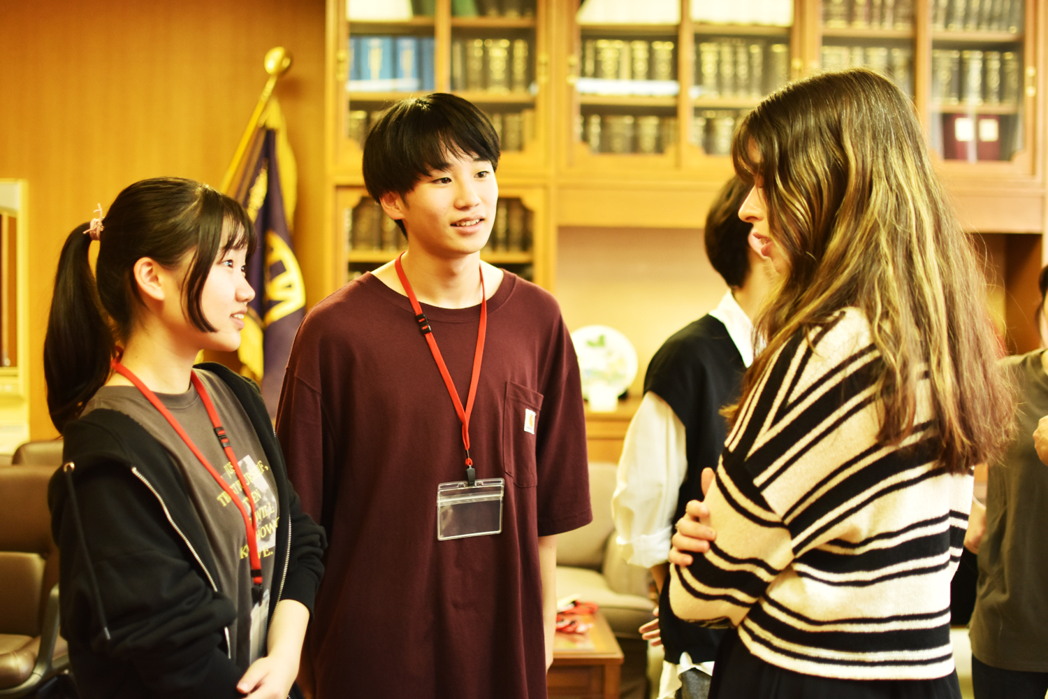 本校と同じ吉備中央町にある「岡山英語村ナノビレッジ」様は、主にワーキングホリデーで長期滞在している外国人ゲストを家族として受け入れ一緒に生活するという古民家宿です。今日はイギリスの方2名、ウクライナの方1名とスタッフの方が本校を訪れ、インターナショナルコースを中心とした生徒と交流しました。