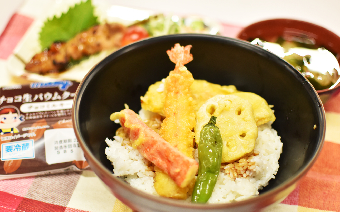 メインは天丼(もちろんエビ天あり)、焼き鳥にサラダ、そうめん汁、デザートはバウムクーヘンと盛りだくさんです。北海道研修に行っている2年生にも負けないボリュームですぞ!