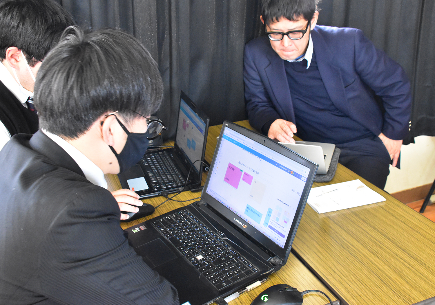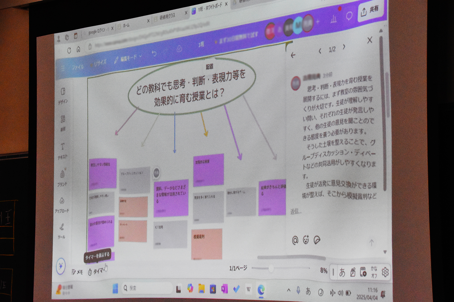 「KJ法」で様々なアイデアを出し合い、整理してまとめや発表を行いました。また、今回は情報共有のツールとして「Canva」のホワイトボード機能を活用しました。模造紙に付箋を貼り付けるという意味では同じ作業ですが、パソコンの画面上でテキストを入力したり、図形や矢印を挿入したりするため、アイデアが出やすかったり、まとめていく過程がよりスムーズだったりと便利なツールを使うことで、議論が活性化するということも体験できました。
