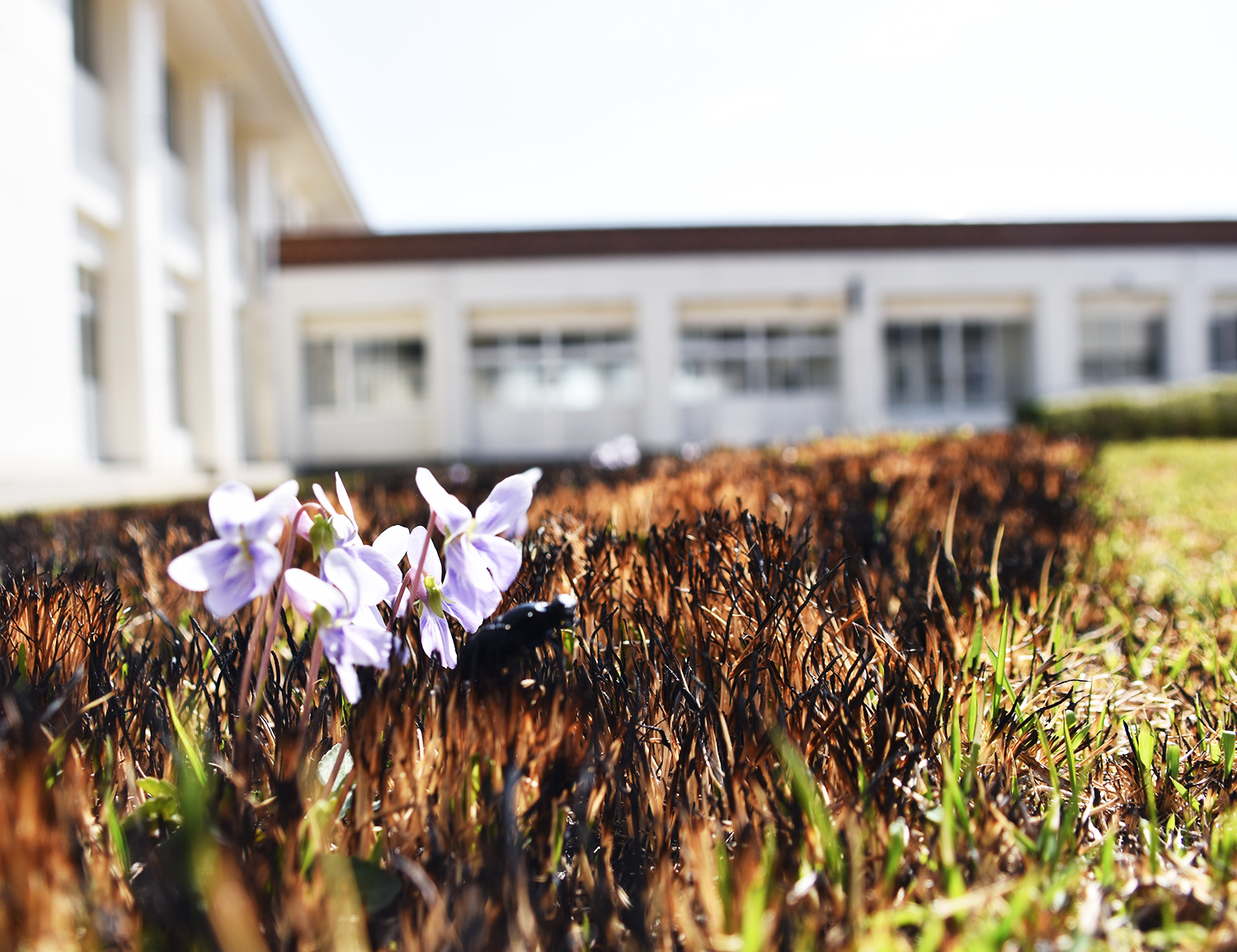 中庭の芝絵は「芝焼き」をした部分から花が!(実は花の下から虫が出てきているんですが、見えますか?)