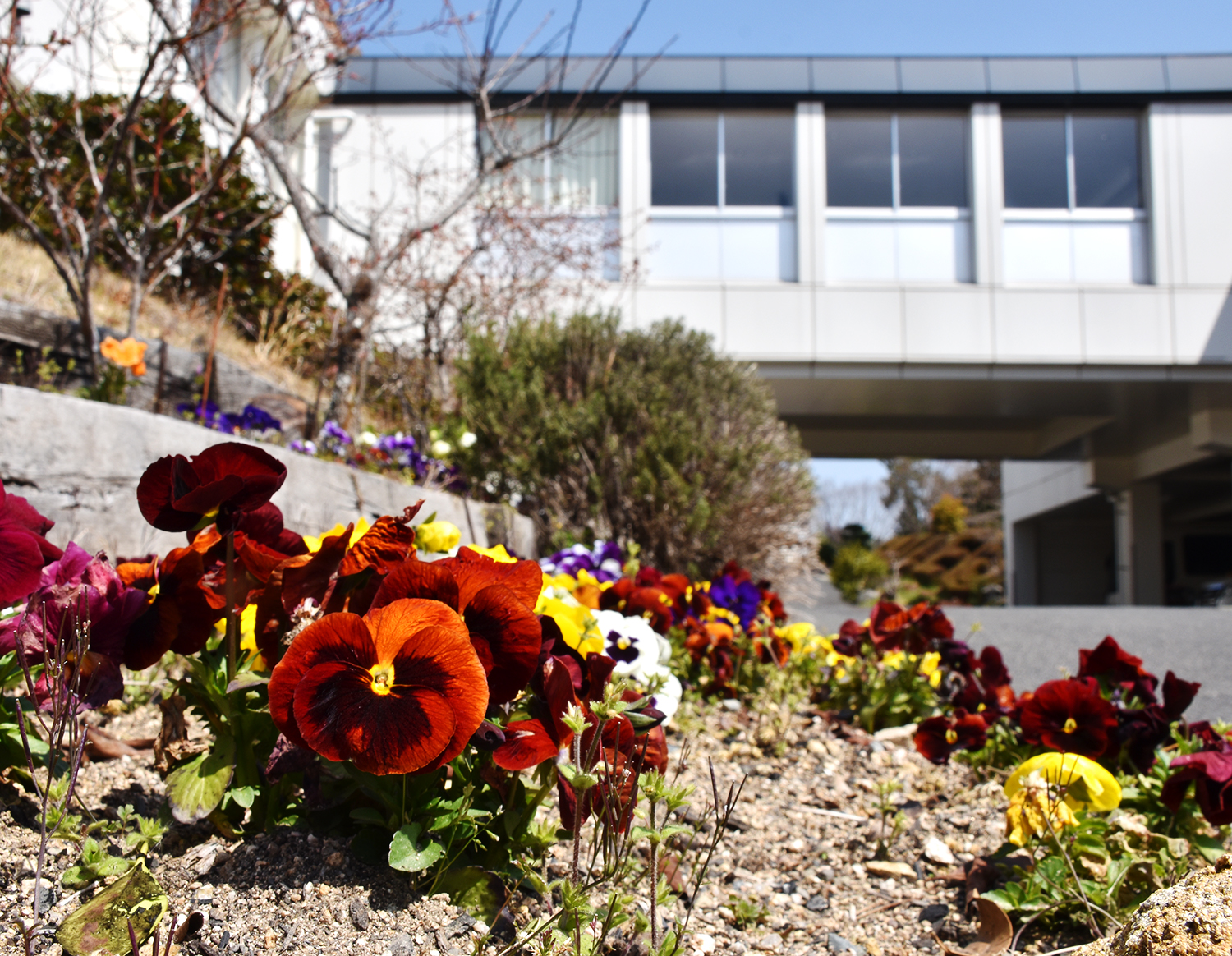 校内の桜並木は八分咲き?ほどですので、11日(金)の入学式まで頑張って欲しいです! また、その他の花も元気に咲き誇っていますよ!