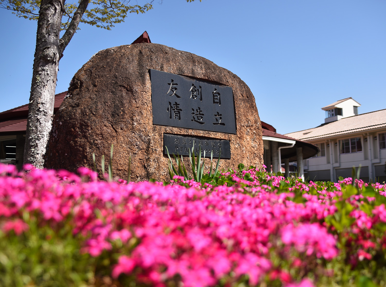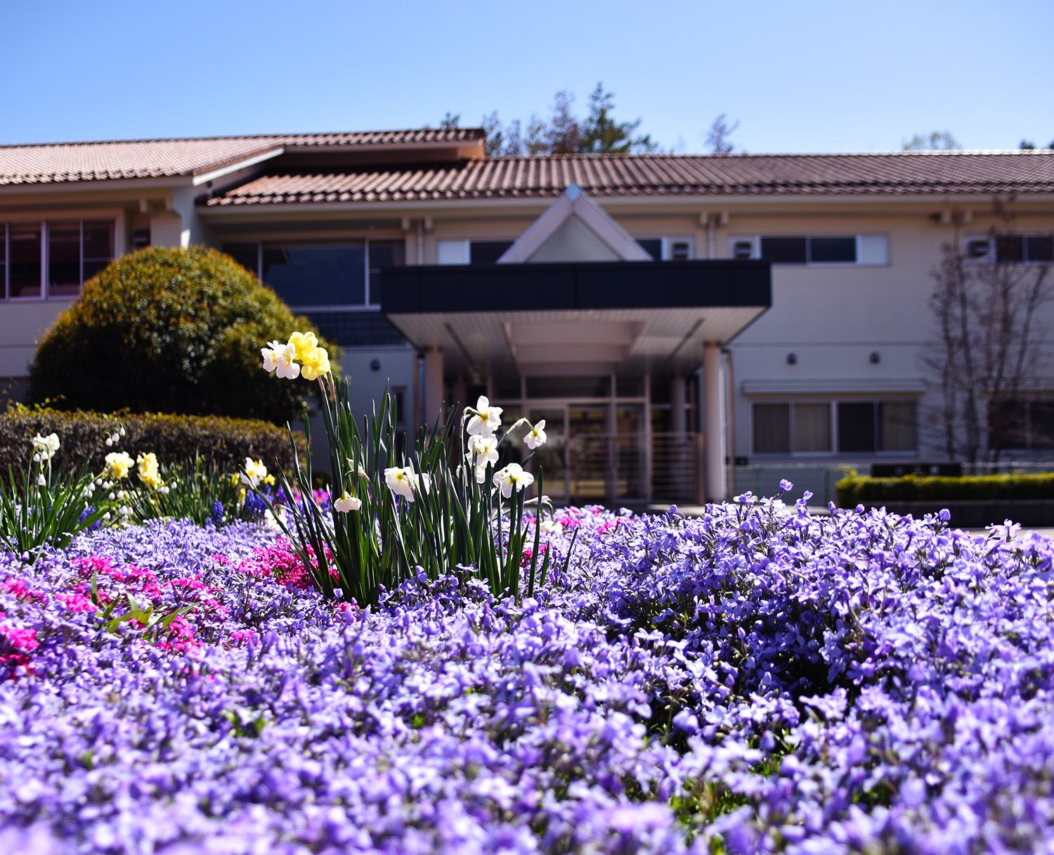 今日は朝から雲一つない快晴で、気温もほどほど、爽やかな一日になりました。桜坂はすっかり葉桜になってしまいましたが、食堂の前の花壇は芝桜をはじめ、たくさんの花が咲いています!条件が良かったので、学校案内などで使用する食堂外観の写真撮影を行いました!