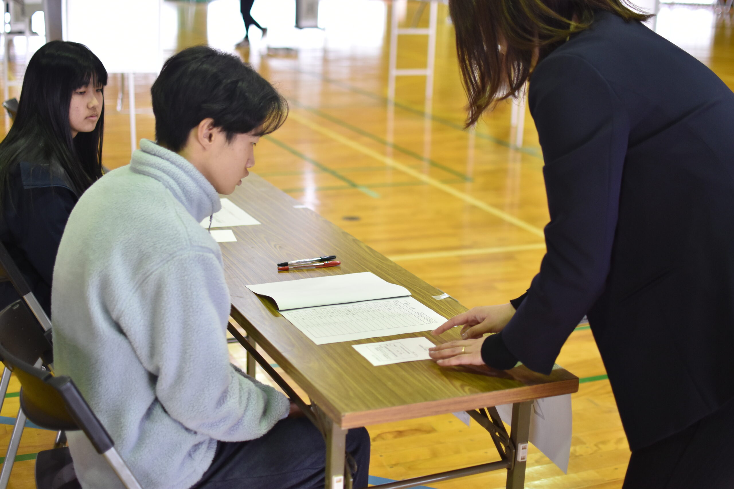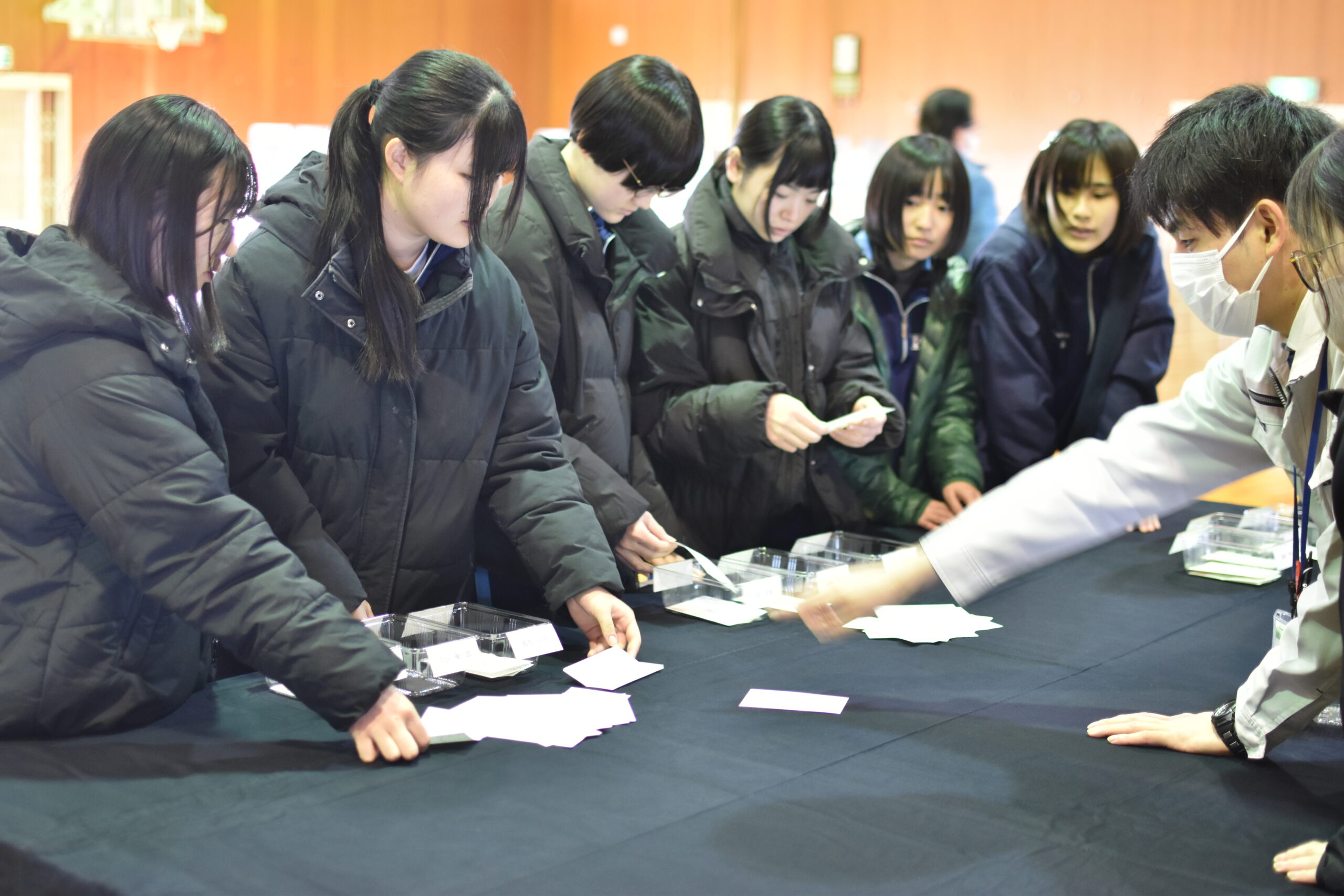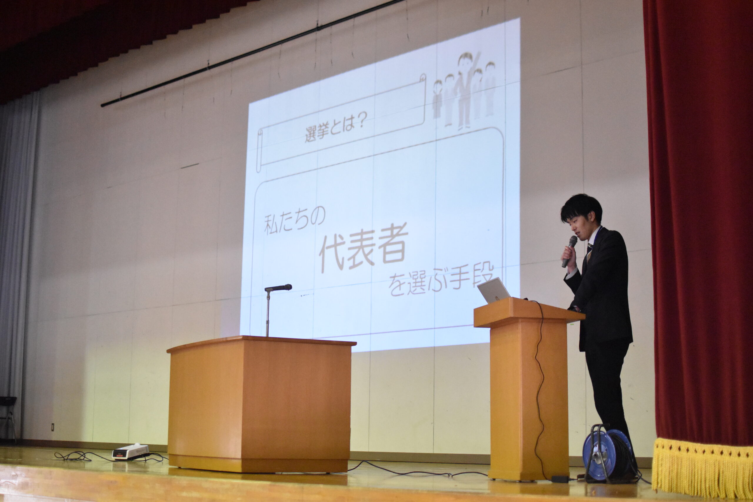 岡山県選挙管理委員会事務局、吉備中央町選挙管理委員会事務局の方にお越しいただき、選挙の仕組み、実際の投票の手順等々、講義を受けました。そして、模擬選挙として生徒の中から3名の候補者を立て、立会演説、投票、開票までの流れを体験しました。体育館の中には実際に使用される投票箱が設置され、投票所の雰囲気を味わうことができました。来年は多くの生徒が選挙権を持つ学年、社会への繋がりを感じる良い学びになりました。
