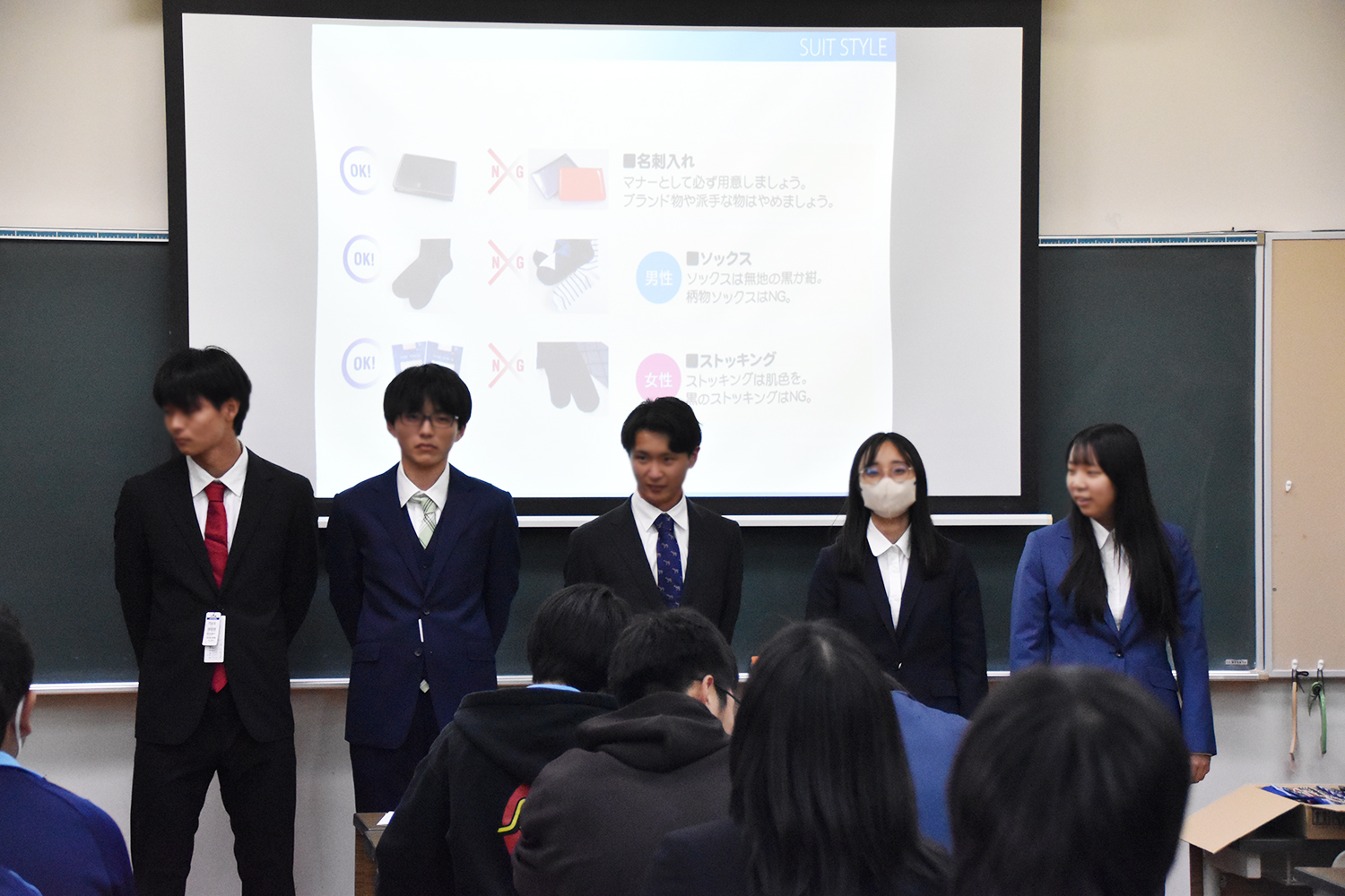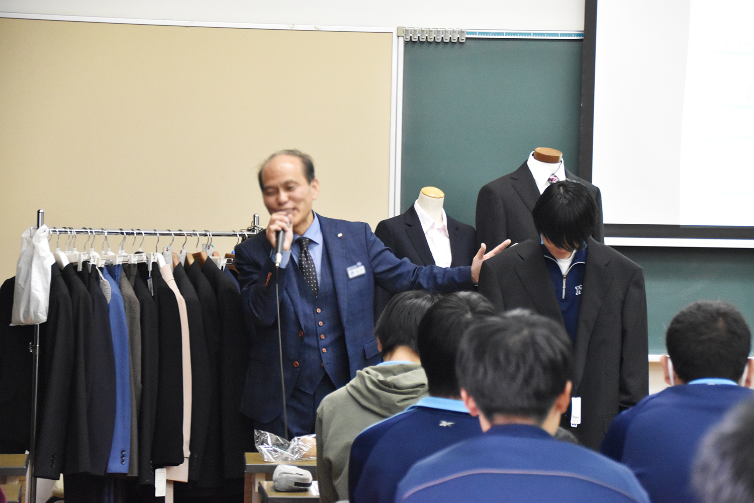今日は、洋服の青山様に来ていただき、3年生を対象に「着こなし講座」を行いました。自分が着たい洋服をオシャレに着ることとTPOを踏まえた「着こなし」の違いについて学び、より良く見せるためのコツも教えていただきました。講座の後半では女子生徒2名と男子生徒3名がモデルとして登場!緊張した表情でしたが、大人の気分を味わうことが出来たかな?