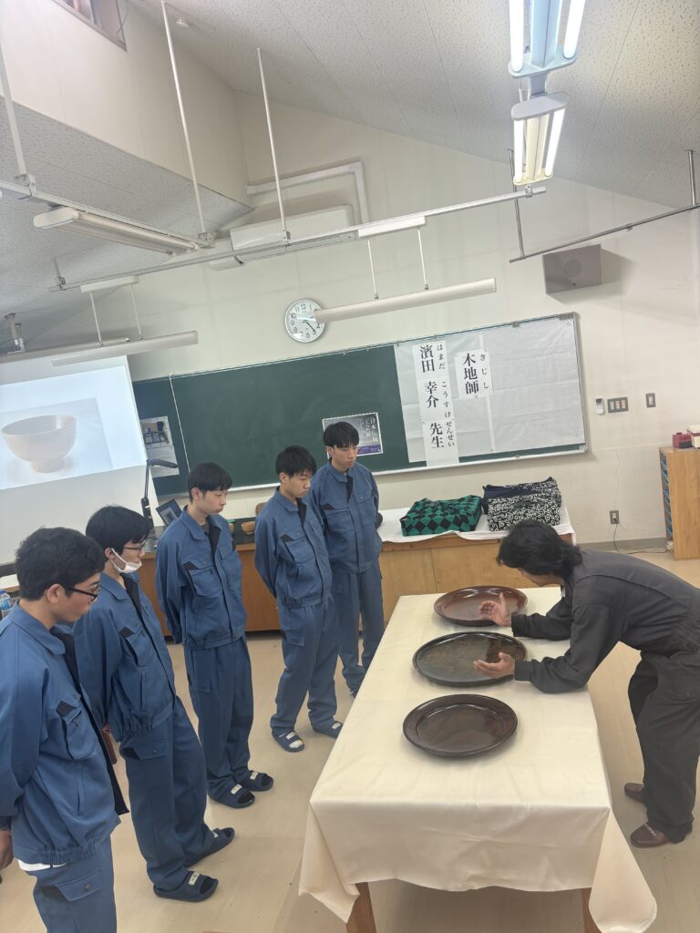 生徒たちは、自身の進路選択とも重ね合わせながら、先生の言葉に熱心に耳を傾けていました。講義では、器ができるまでの工程や、現在コースで取り組んでいる拭き漆の技法についても丁寧に教えていただきました。