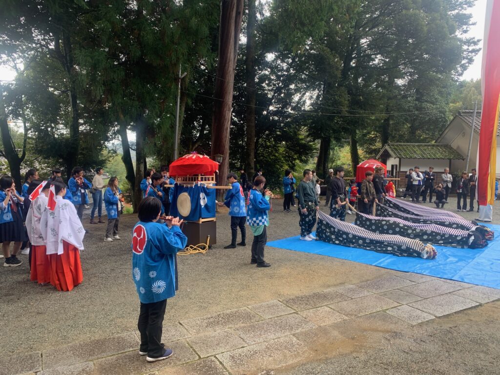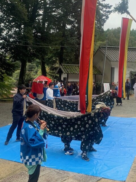 当日は雨予報でしたが、みんなの願いが通じて晴れ間がのぞき、無事に当番祭を開催!笛や太鼓、そして獅子(谷田先生)の迫力ある演舞で大活躍でした。地域の方々からも大きな拍手をいただき、とても感謝していただきました。