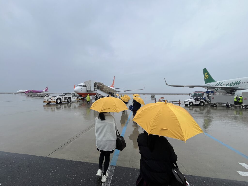 関空はあいにくの雨。飛行機までは傘をさして向かいました。