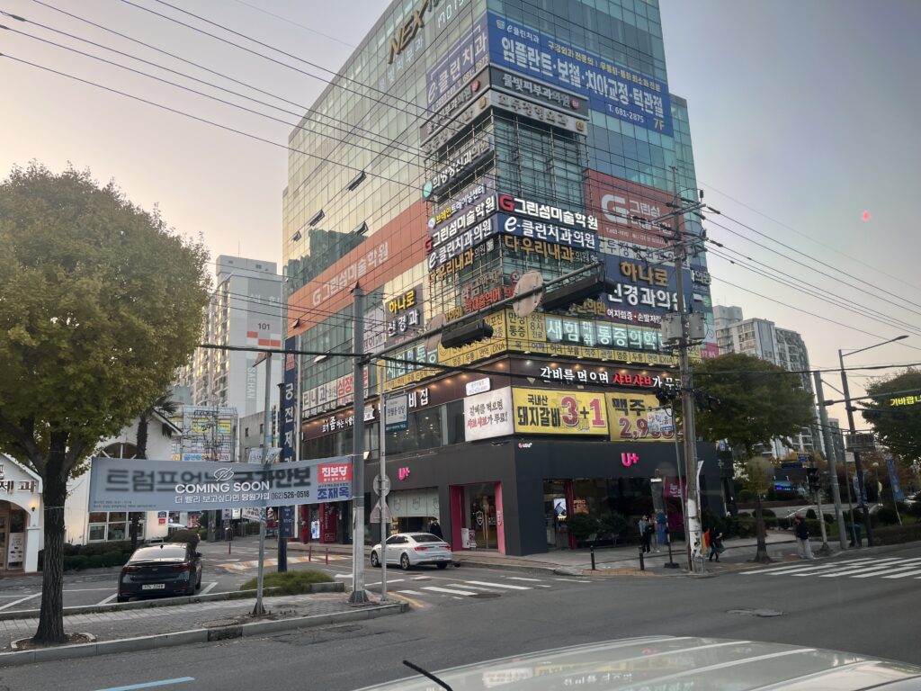 韓国の街並み。日本と似ていますが、看板は全てハングルです。自動車も右側通行。