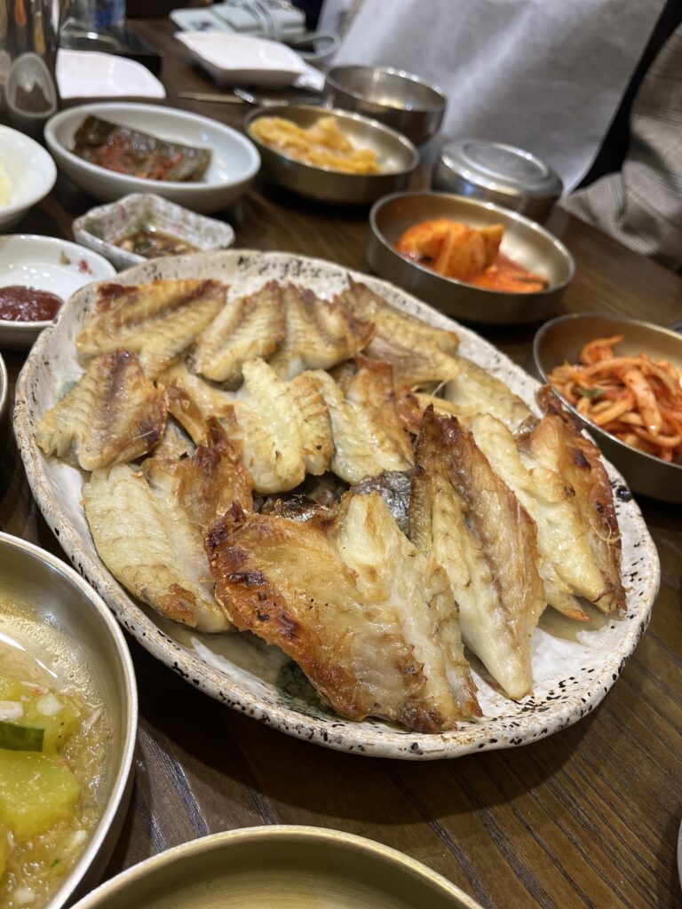 本場の韓国料理。イシモチという魚がメインで、周りにキムチなどのおかずが並びます。