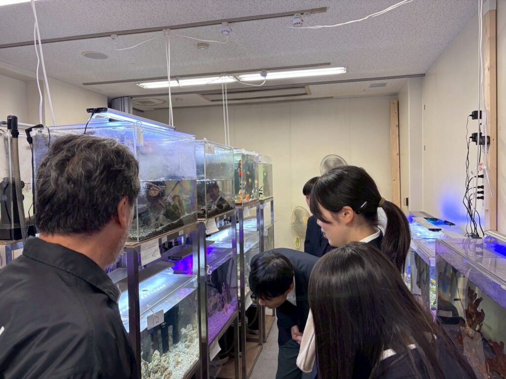 アクアリウム学科では、複数の水槽で魚や生き物が飼育されている様子を見学しました。水槽ごとに工夫されたレイアウトや管理方法の説明を聞きながら、水生生物の世界の奥深さに触れることができました。
