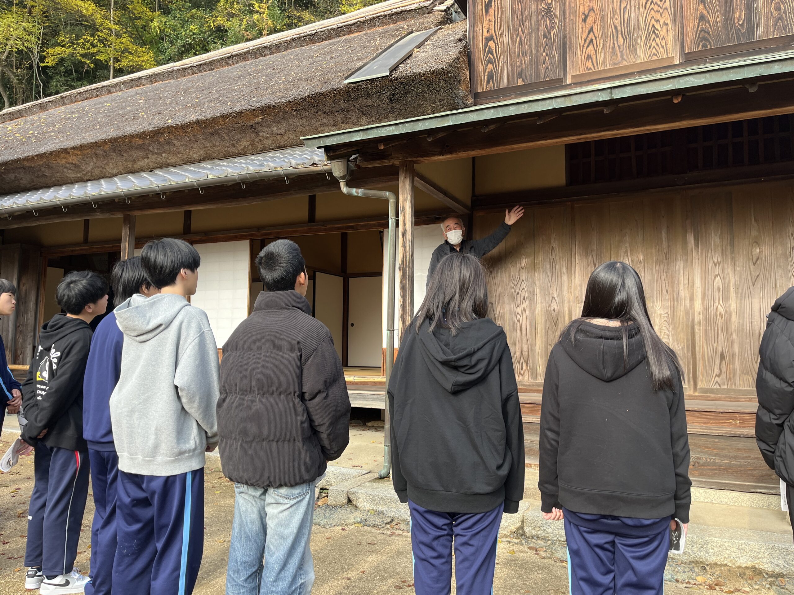 当日は、まず近水園のパンフレットをもとに、庭園の全体的な構成や池・橋・石灯籠といった景観要素、周囲の植栽、そして隣接する屋敷のたたずまいについて確認しました。その後、生徒たちはグループごとに園内を散策し、気になった場所や印象に残った風景を写真に収めながら、庭園や屋敷の雰囲気をじっくりと味わいました。