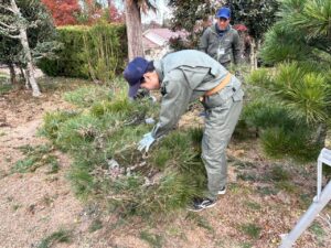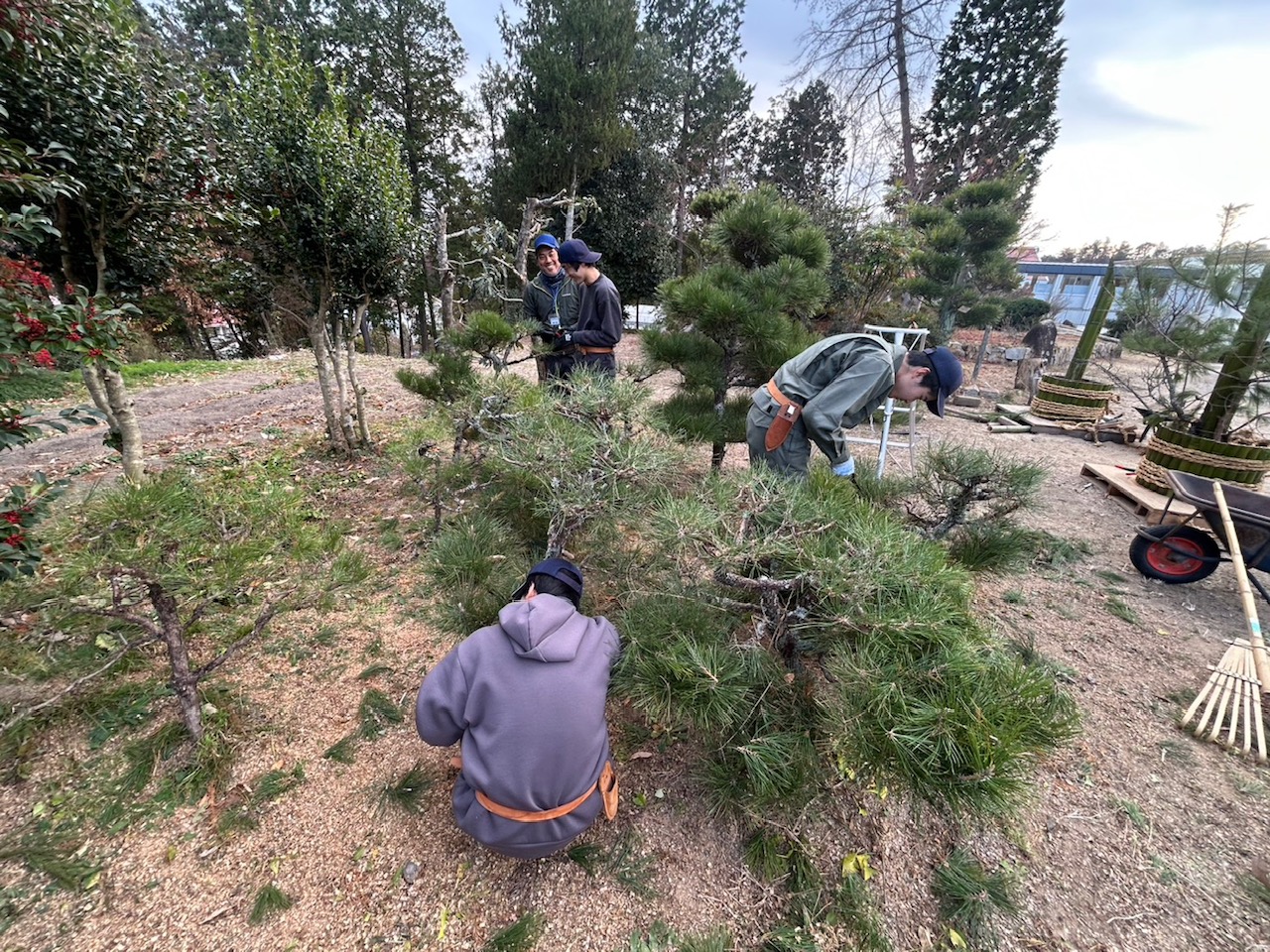 松の剪定や門松の準備を、緑化システムコースの生徒たちが担当し、冬の冷たい風が吹く中、一生懸命作業に取り組んでくれています。