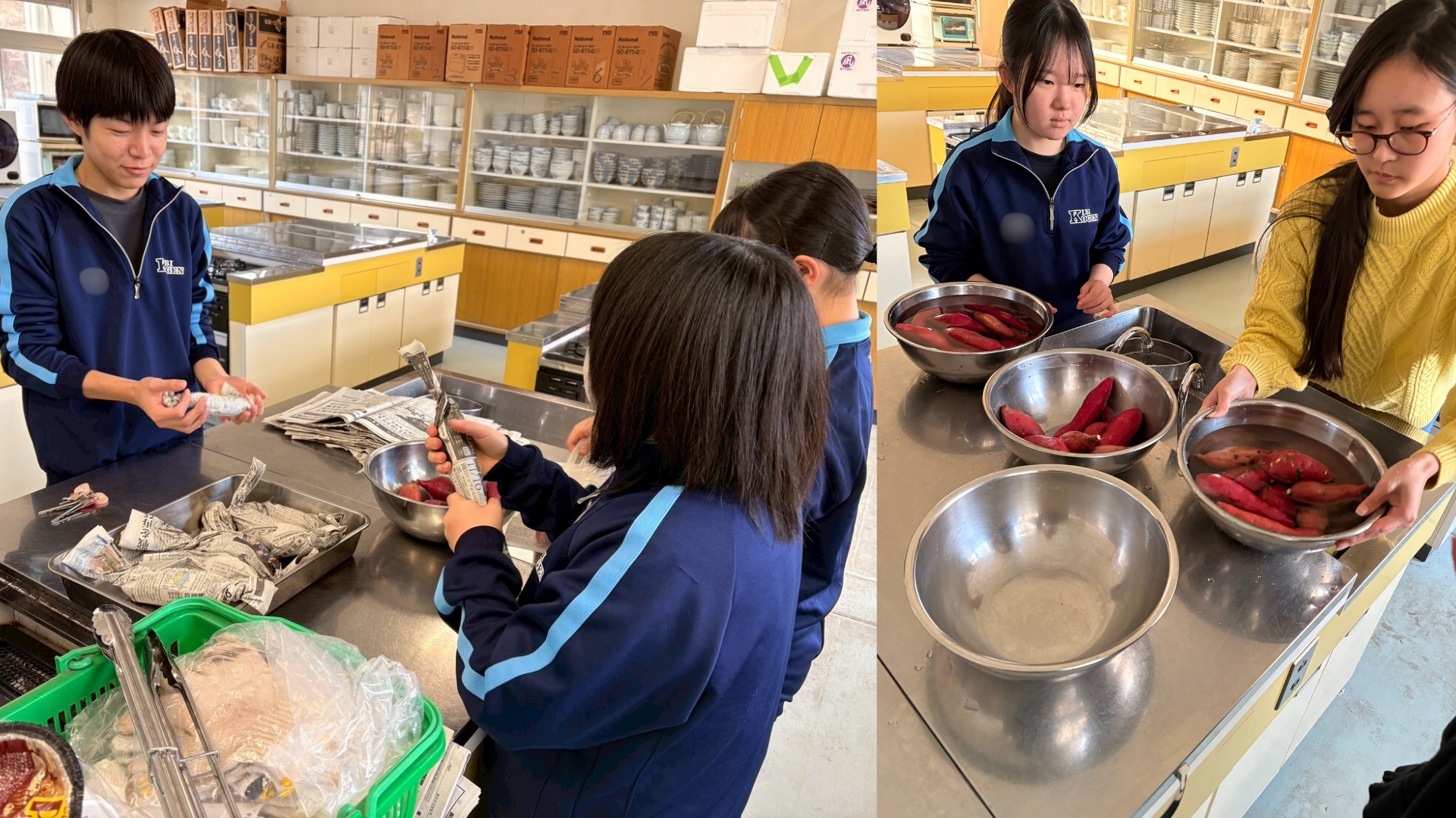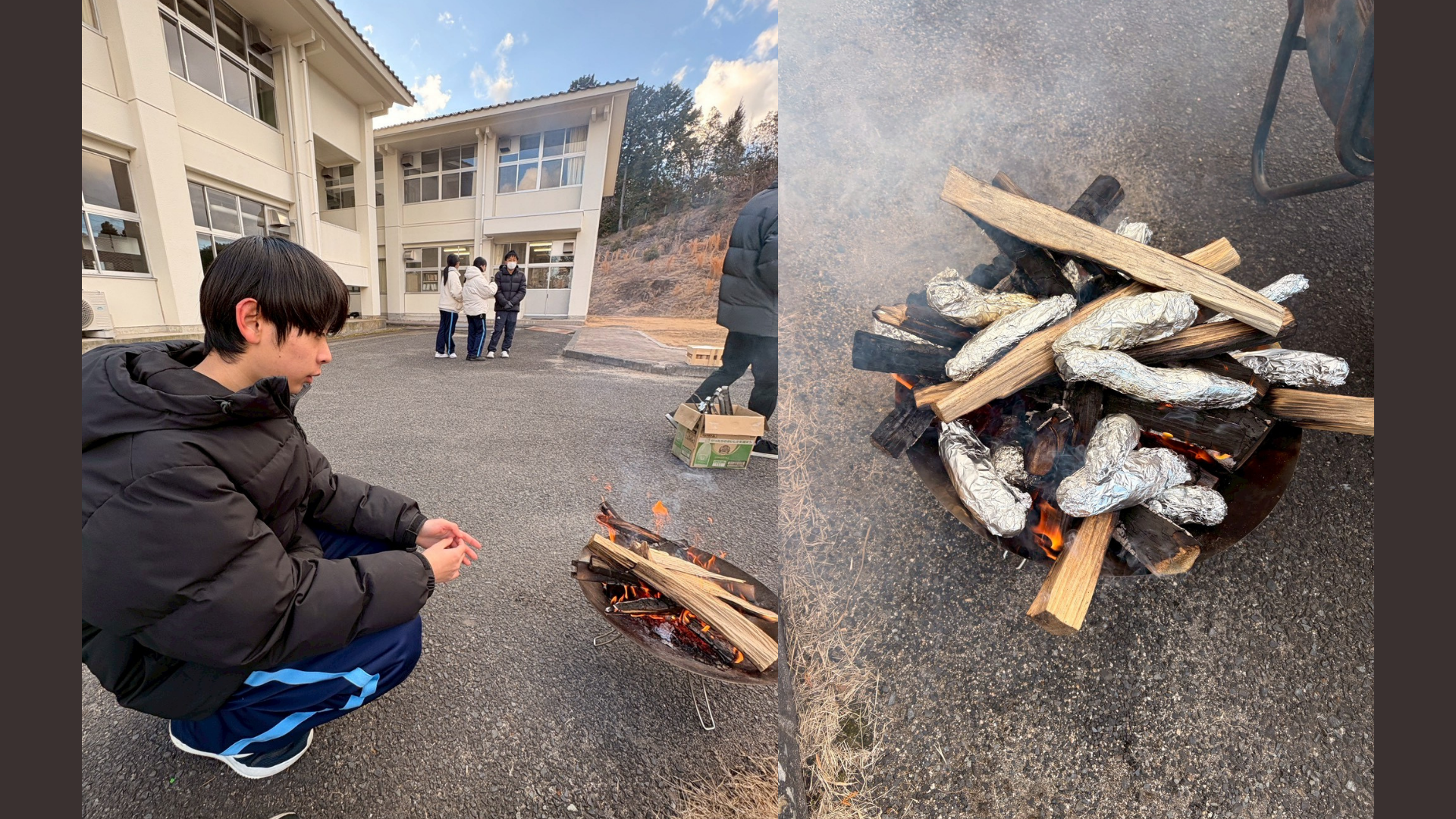 この活動に向けて、生徒たちは前日から準備に取り組みました。校内にあった枯れ松の丸太を使って薪割りを行い、購入したさつまいもは、一つ一つ丁寧に洗い、塩水に浸す下処理まで生徒自身の手で行いました。