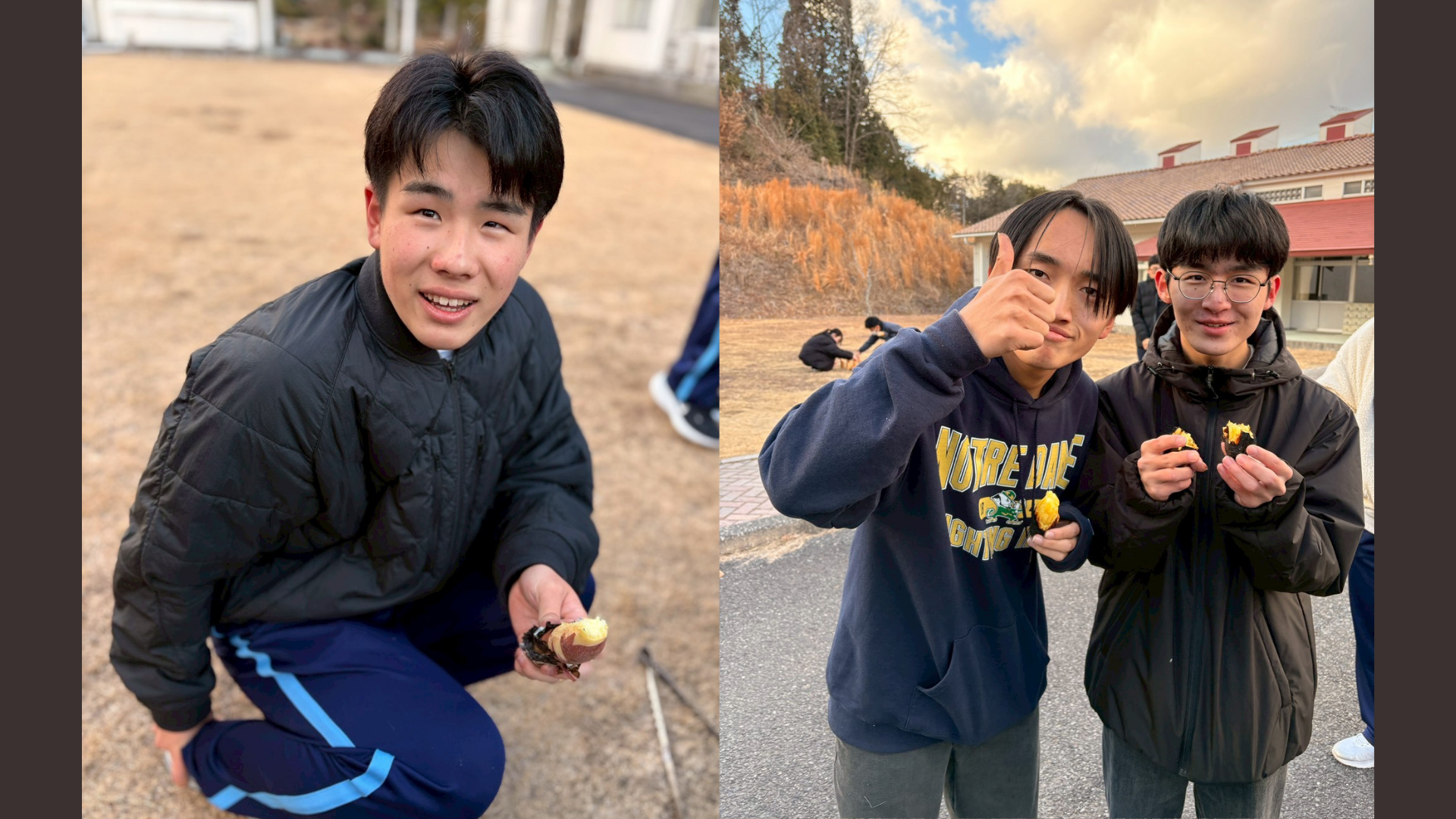焼き上がったさつまいもを取り出し、アルミホイルを開けると、外側は炭のように真っ黒な状態でした。「これは食べられるのだろうか」と不安そうな表情を見せる生徒もいましたが、皮をむいてみると中から現れたのは、きれいな黄金色の焼き芋。予想外の展開に、驚きと歓声が上がりました。実際に食べてみると、甘くホクホクとした味わいで、生徒たちは大満足の様子でした。