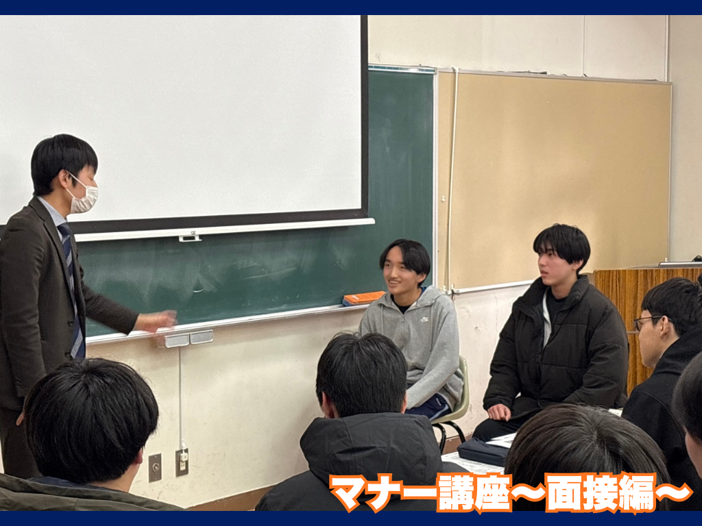 講座の前半では、「メラビアンの法則」を題材に、面接において第一印象がいかに大切かを学びました。服装や頭髪、身だしなみについては、友人同士で確認し合いながら、自分では気づきにくい点にも目を向ける時間となりました。