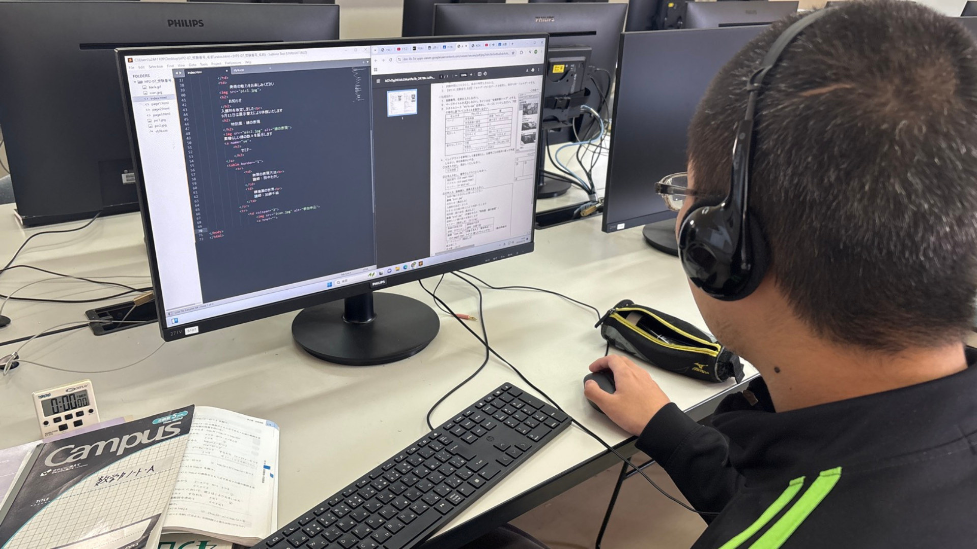 情報システムコース2年生の授業では、HTMLとCSSを用いたホームページ制作に取り組みました。とある日の授業では、見本や手順を確認しながら、基本的なページを一つずつ形にしていく学習を行いました。