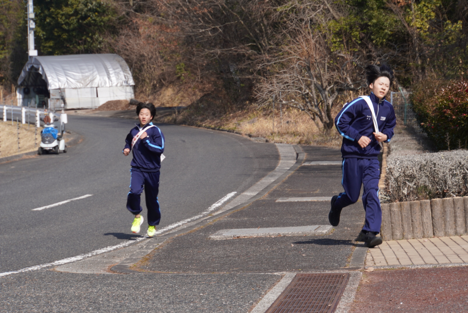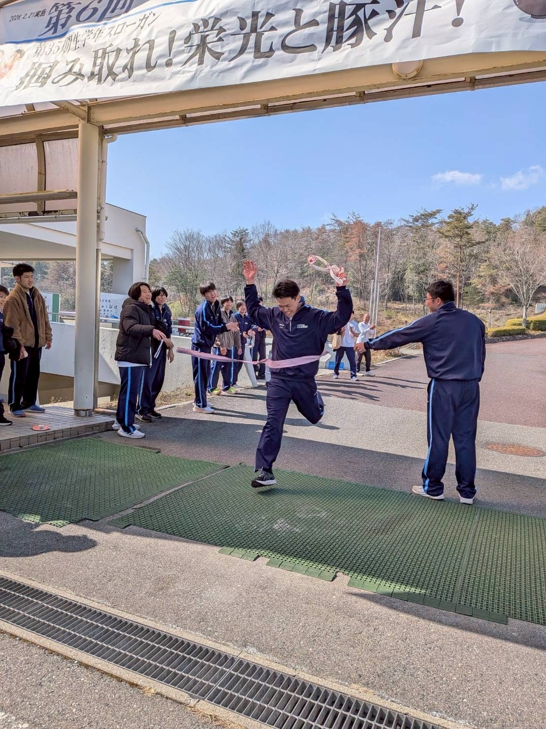 2月21日(土)、毎年恒例の駅伝豚汁大会が行われました。同大会は1年生対象の行事で、今年で6回目を迎えます。競技は1年生3クラスの対抗戦で、各クラスでタスキを繋ぎ、学校の外周を走ります。1人半周〜1周を担当し、クラス担任も参加しました。短い距離とはいえ、アップダウンが激しく、ハイペースで走るとなかなかハードです。