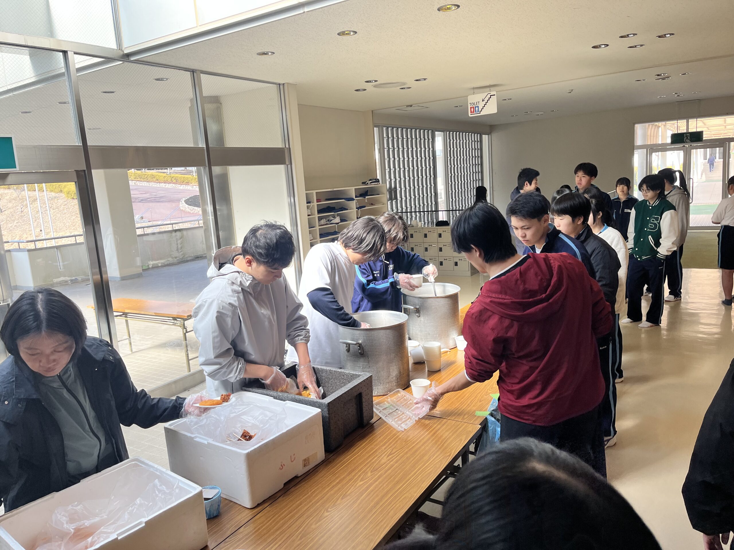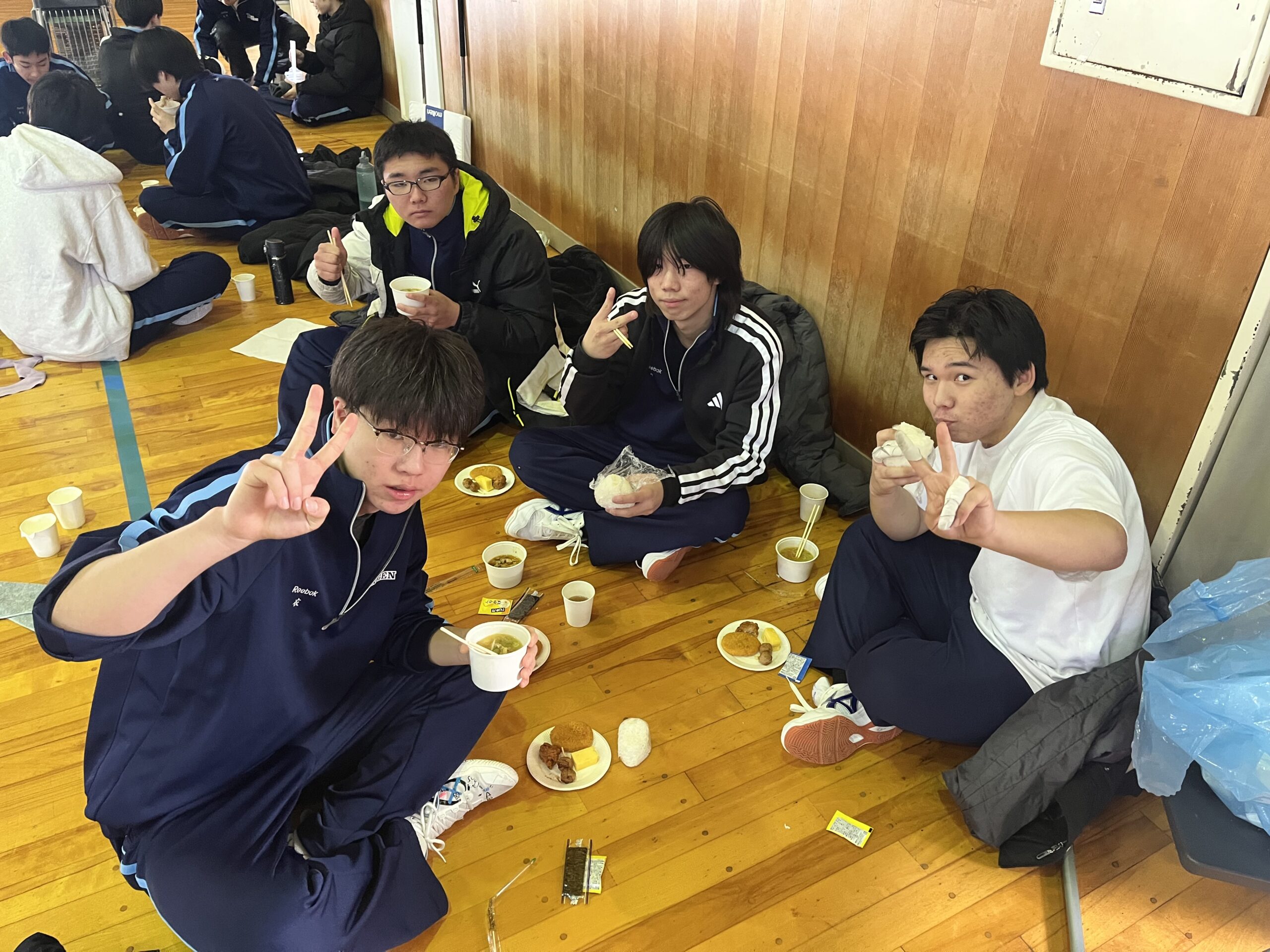 閉会式の後は体育館内で豚汁とおにぎりをいただきました。おにぎりは競技の前に係生徒が握ってくれた手作りです。みんな「学食以上に美味しい!」と大好評でお代わりの長い列ができていました。