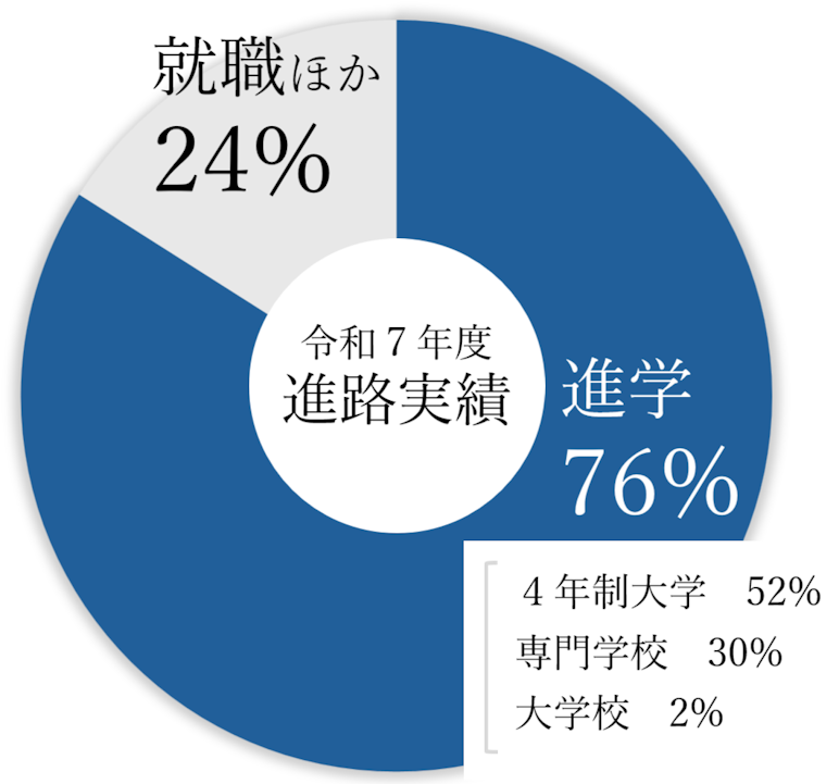 本校の卒業生は、約80%が進学(大学、短期大学、専門学校)、約20%は就職しており、